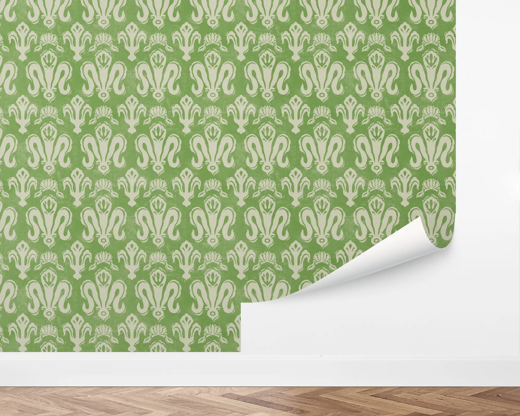Add an antique accent to any wall in your home with our Amari Fleur De Lis Peel And Stick Removable Wallpaper. Shell illustrations of the recognizable emblem are placed in rows on a textured moss background. Choose from endless color combinations to match your interior style perfectly!