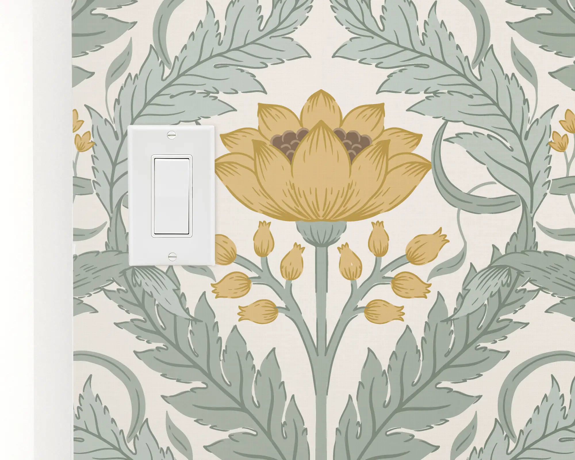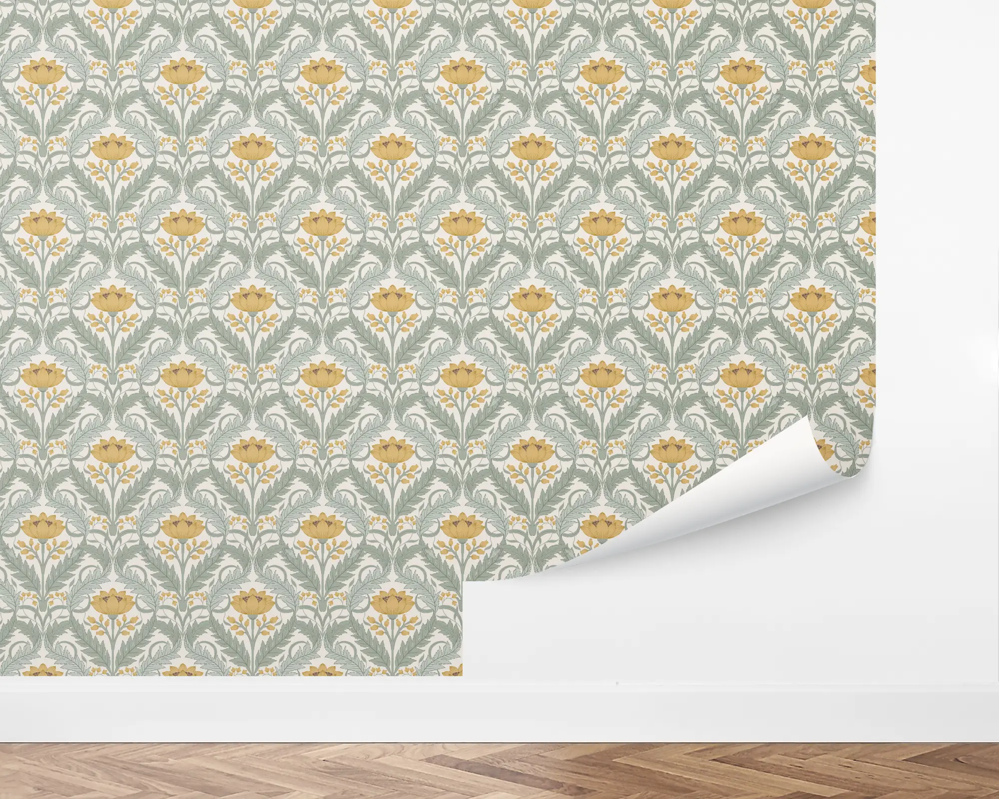 Add an intricate, eye-catching accent wall anywhere in your home with our Art Nouveau Foliage Peel and Stick Wallpaper. Biscotti florals and sage foliage grow in an elegant damask pattern on top of an ivory background. Customize with your favorite combinations of colors to match your interior style perfectly!