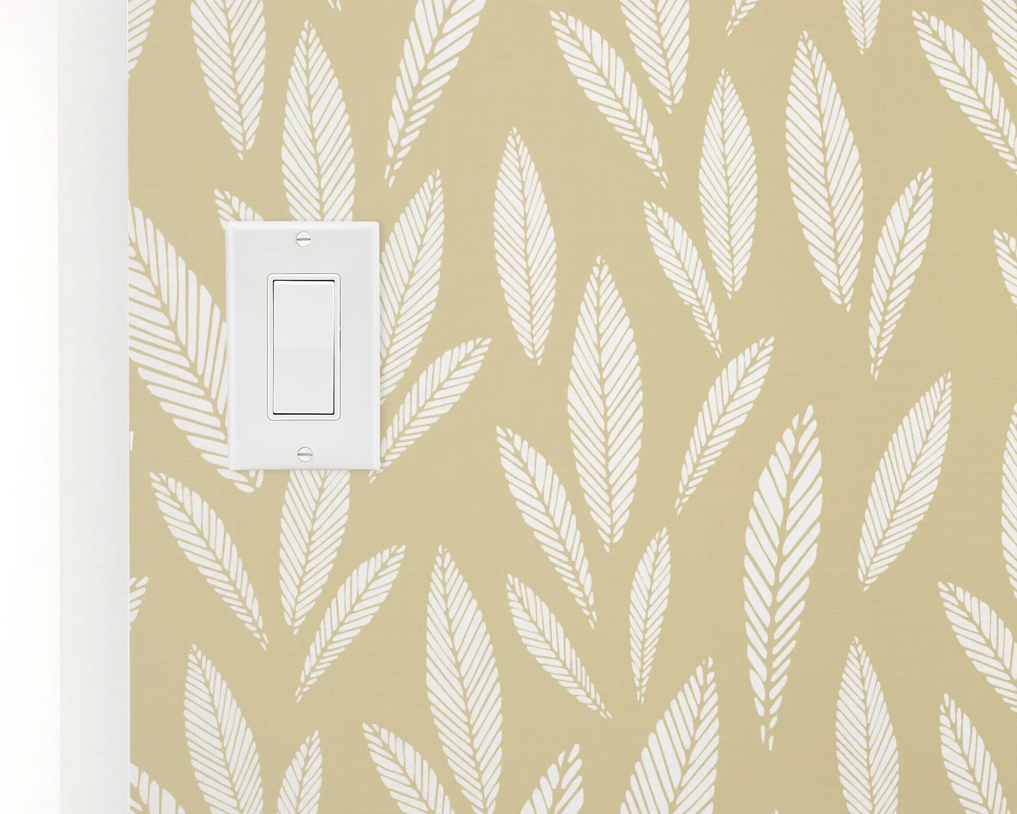 Decorate your walls with our modern Autumn Leaves peel and stick removable wallpaper! White leaves cover a yellow background, in an illustrated topiary.