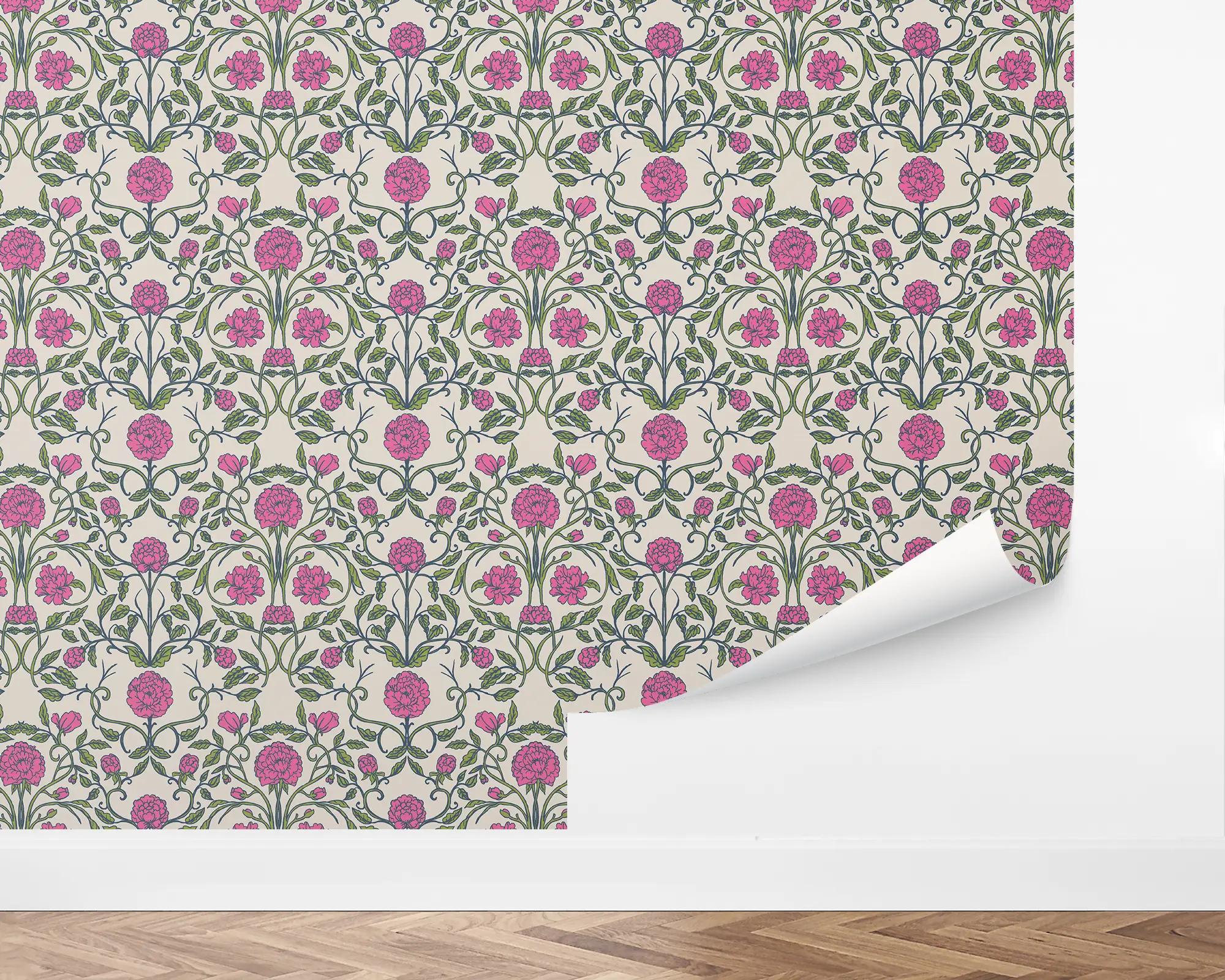The Carnation Damask Wallpaper features a lush floral pattern of pink carnations and green leaves inspired by classic Victorian design. Its elegant botanical motif brings timeless beauty and vintage sophistication to walls, creating a romantic and refined look. Perfect for bedrooms, living rooms, or dining spaces, this peel and stick wallpaper adds charm and depth with a modern twist on traditional damask style.