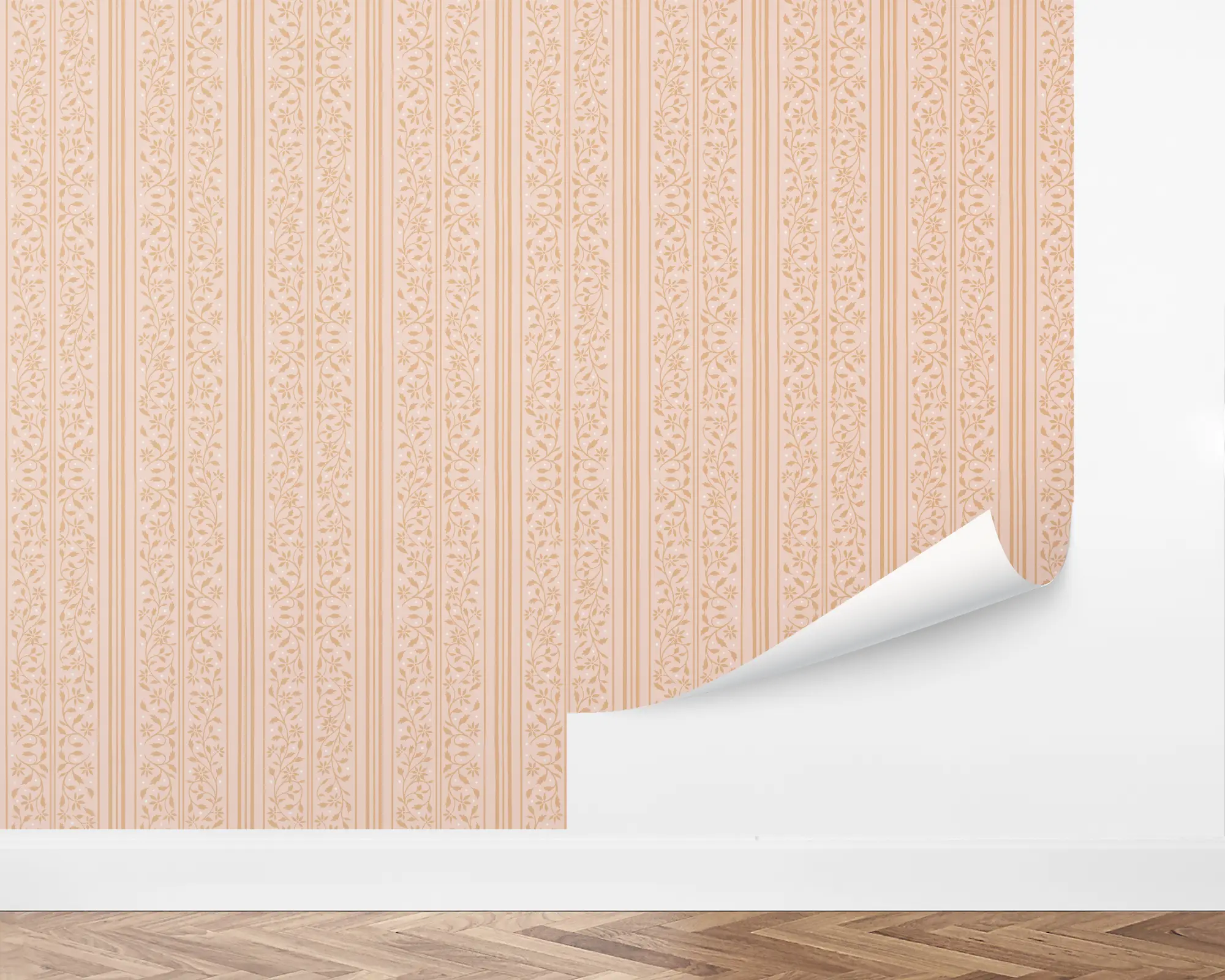 Enter a world of enchantment when you place our Charmed Florals Peel And Stick Removable Wallpaper on any wall in your home. Sunrise illustrations of flowers and stripes entwine on top of a nude background. With endless color combinations available, personalize your space and let your imagination bloom in every corner.