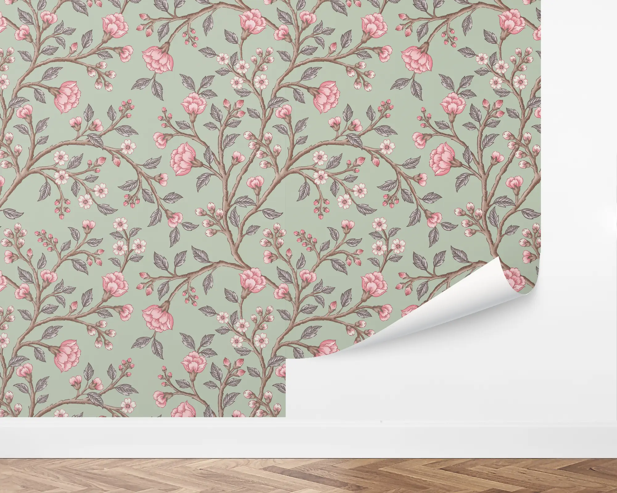 Our Chinoiserie Flowers Peel And Stick Removable Wallpaper is sure to create a vintage vibe to any wall in your home. Intricate illustrations of pink flowers branch out all over a bamboo background. Choose from endless colors to match your interior style perfectly!