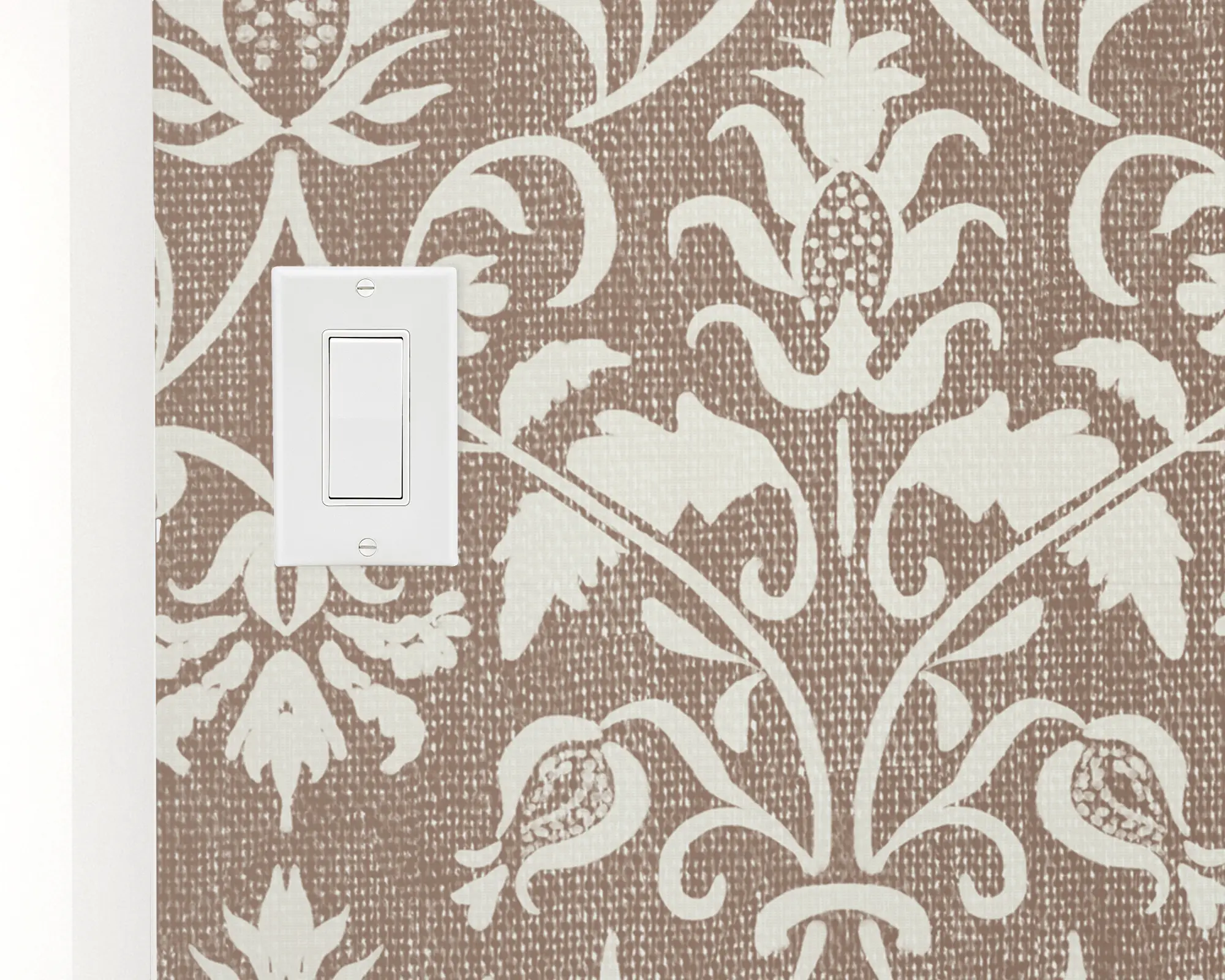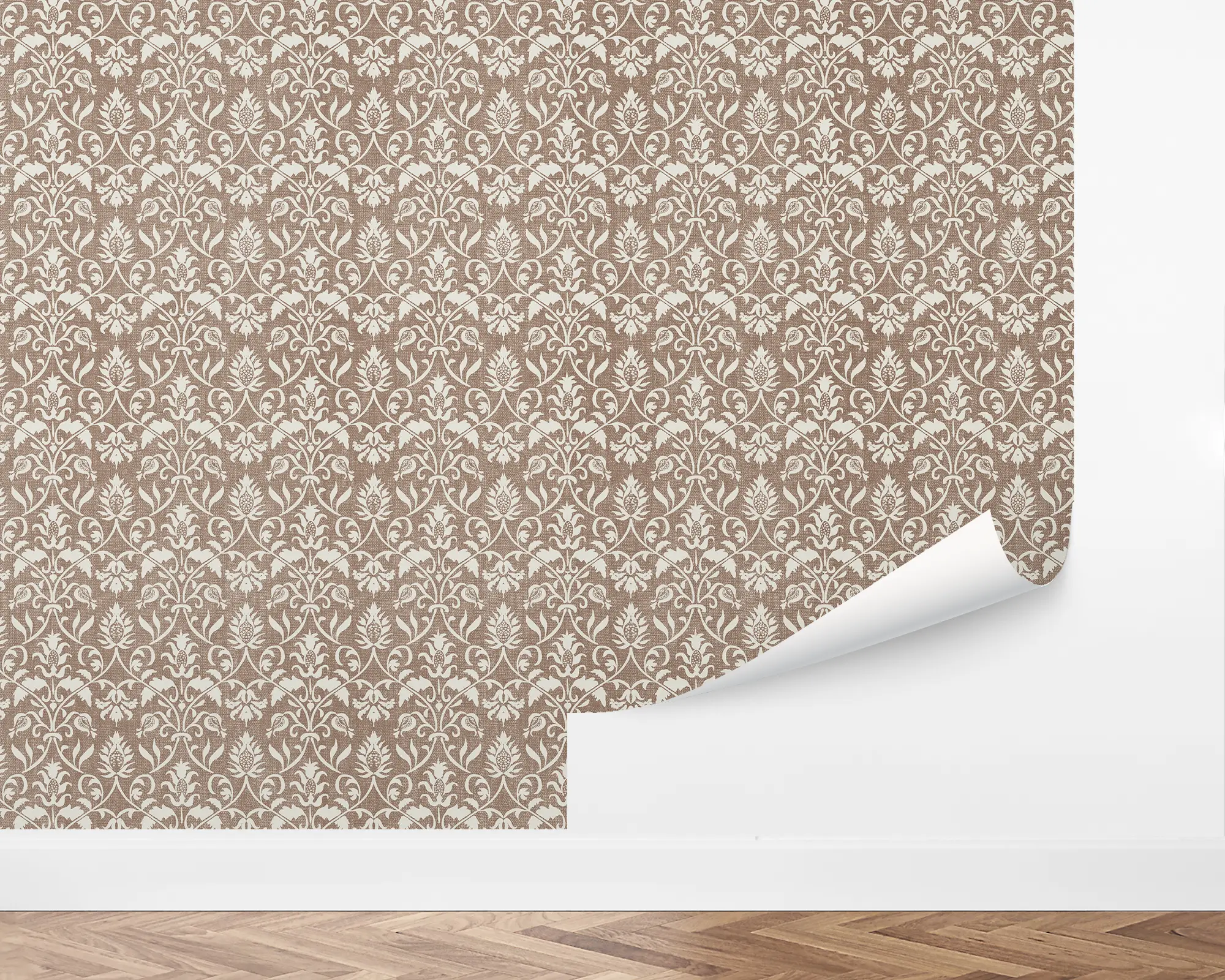 Classic Motif Wallpaper features a traditional ornamental pattern with repeating cream florals layered over a warm taupe background for a timeless, heritage-inspired look. A perfect choice for those seeking a sophisticated, classic wallpaper that balances old-world style with modern ease. Designed for ease and flexibility, this peel and stick wallpaper is removable, renter-friendly, and customizable in over 200 color options.