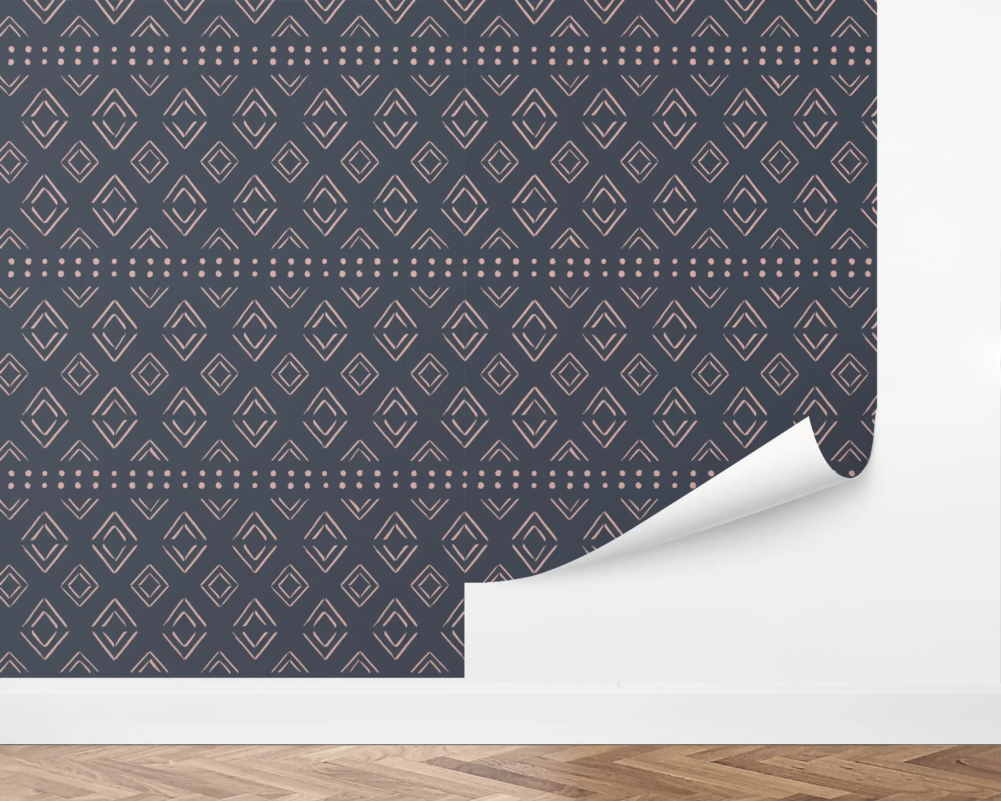 Create a beautiful boho space with our Dots and Diamonds Peel And Stick Removable Wallpaper. This exotic design features an organic, tribal-inspired design over a grey background. Fully customizable with any of our high-quality colors, this wallpaper is the perfect extra touch for your interior design project.