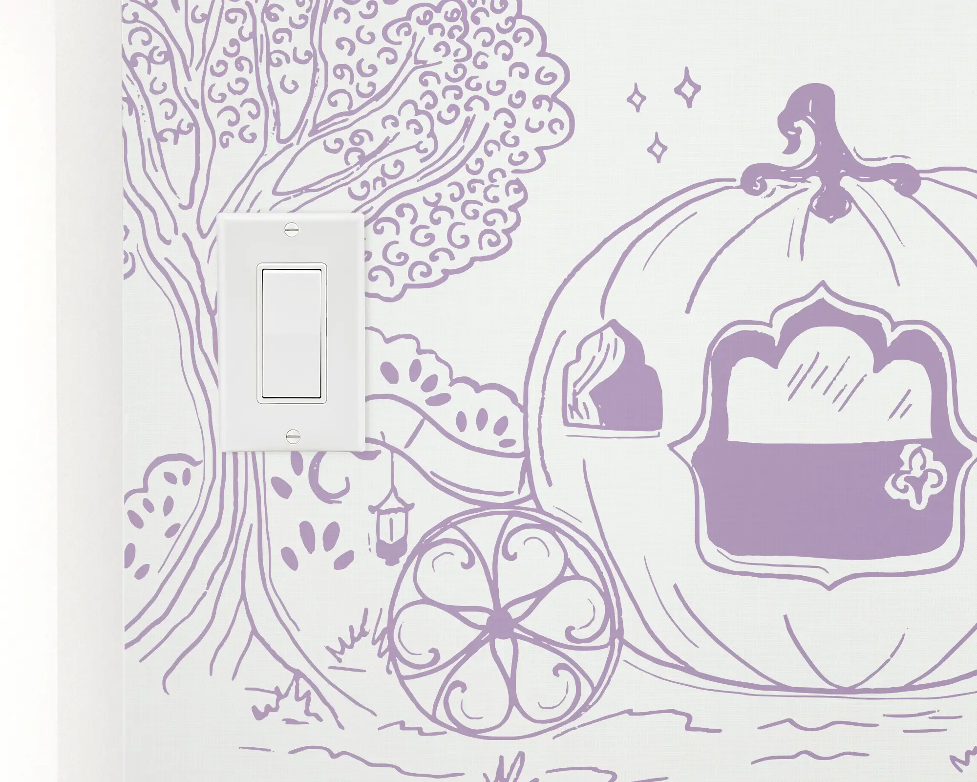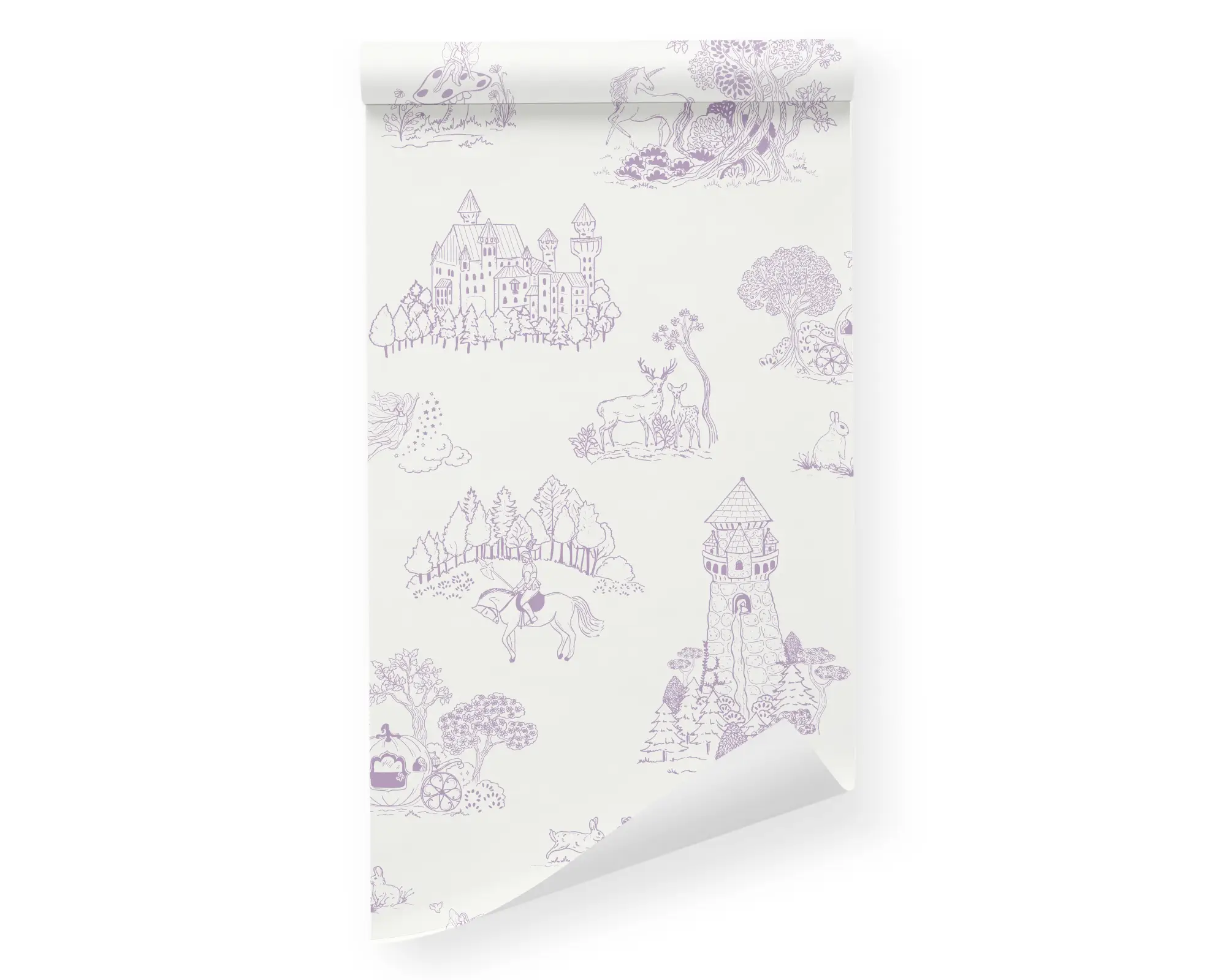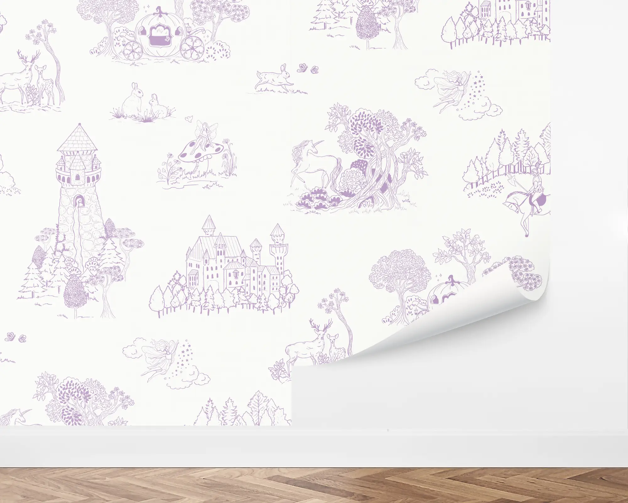 Create the perfect whimsical playroom for your child with our Fairytale Wonderland Peel and Stick Wallpaper. Pageant illustrations of many different princess scenes are handdrawn on top of a ceramic background. With customizations of your favorite colors, this is sure to match your personal style!