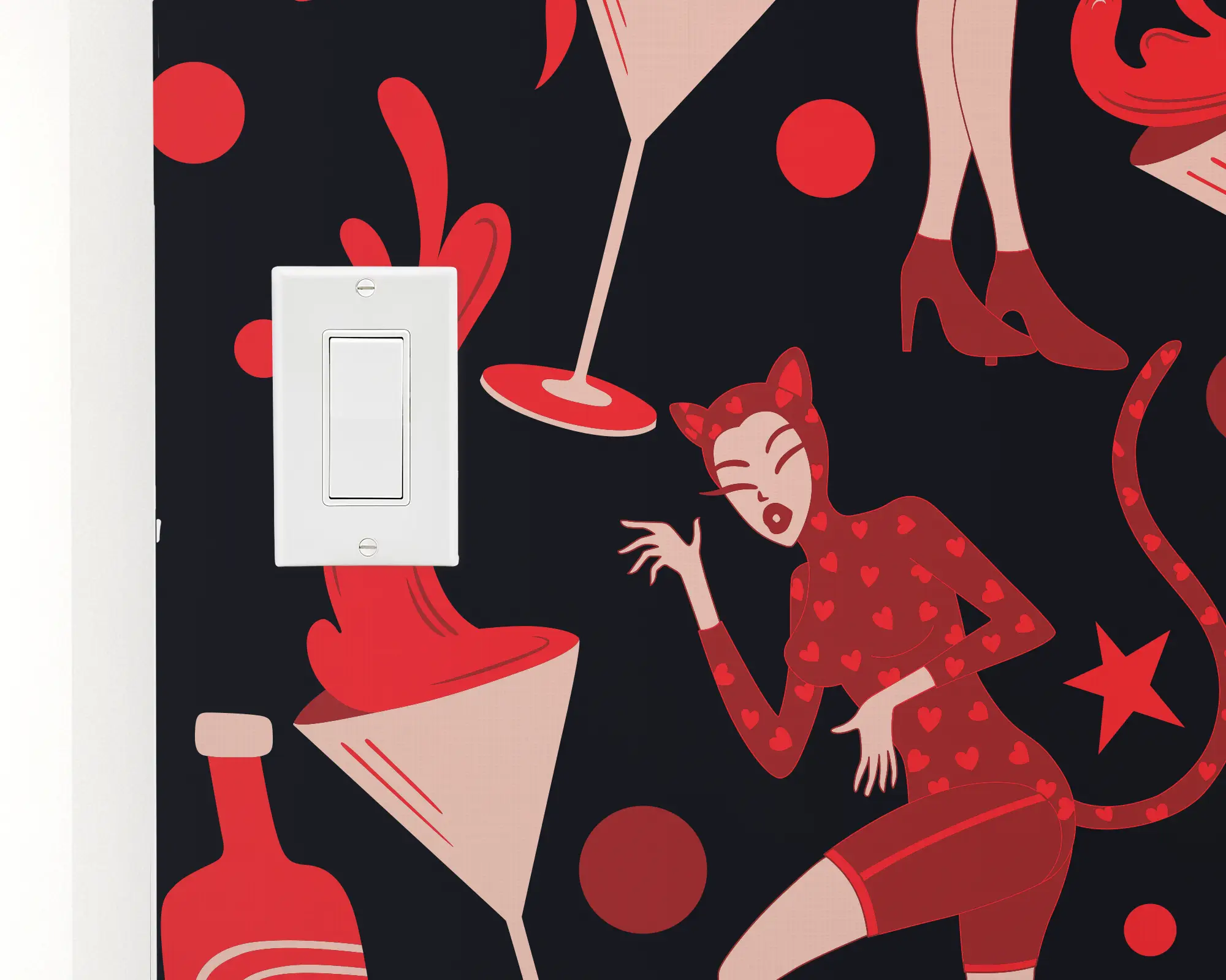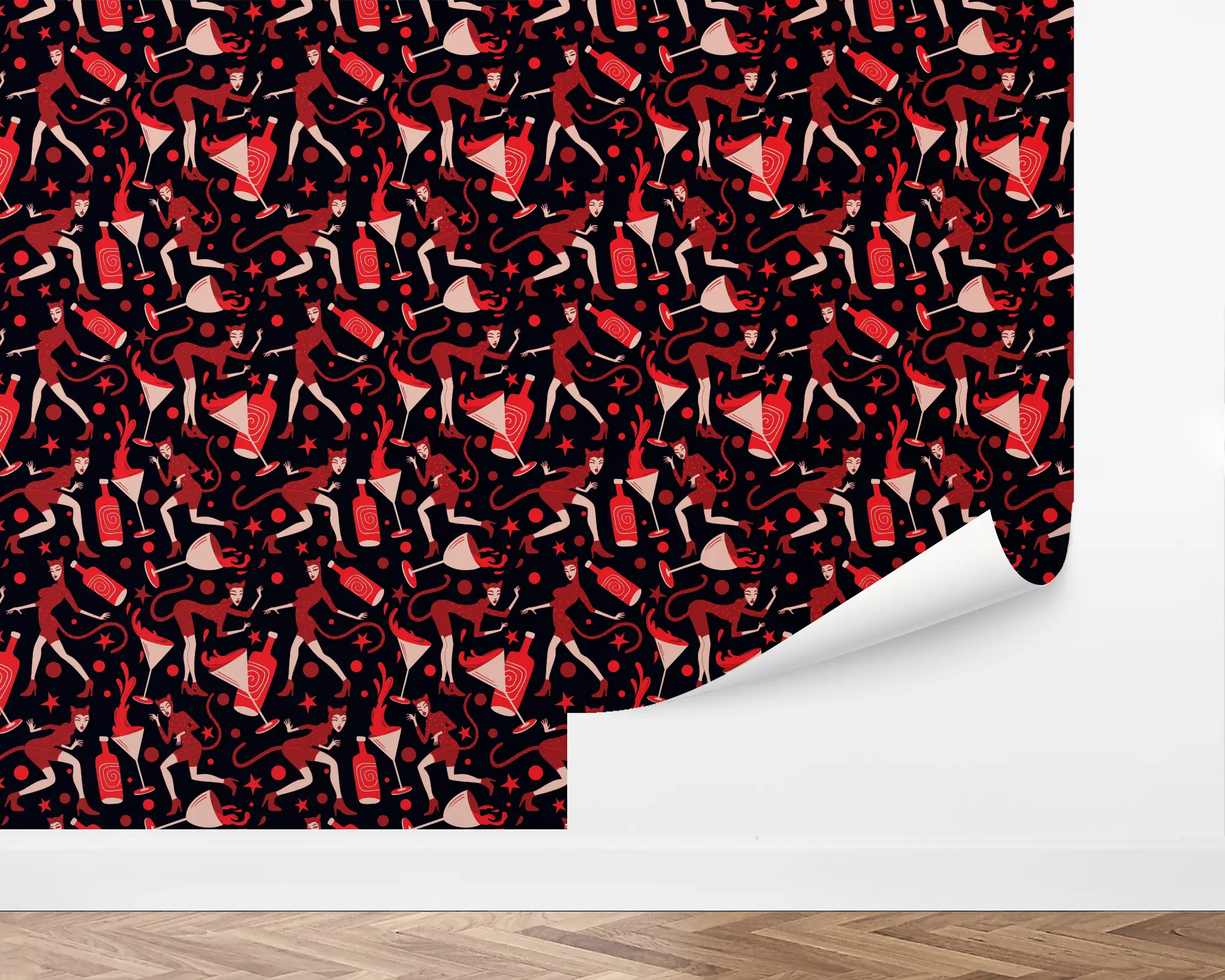 Bring bold personality to your walls with our Fine Feline Wallpaper, a playful pattern featuring stylish cats, cocktails, masks, and stars in striking red, black, and cream tones. This retro-inspired peel and stick wallpaper adds a whimsical yet modern touch, perfect for eclectic home bars, lounge rooms, or statement walls. Designed for easy application and fully removable, this fun design is ideal for renters and homeowners alike looking to showcase their unique style.