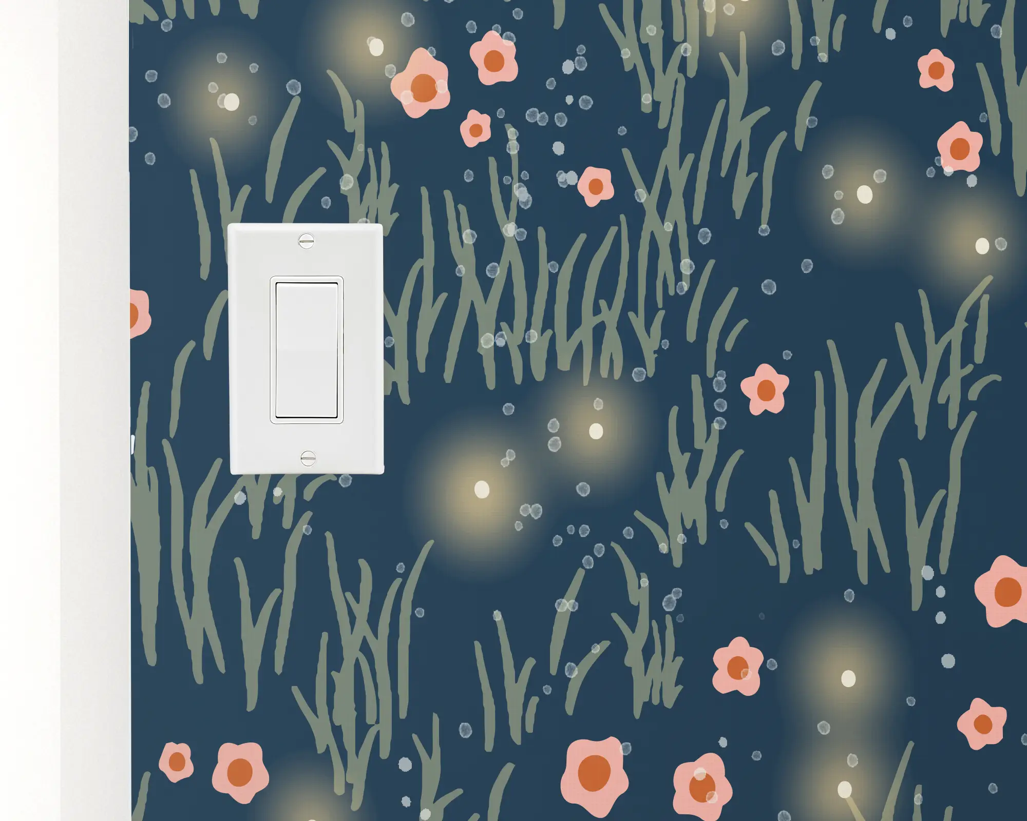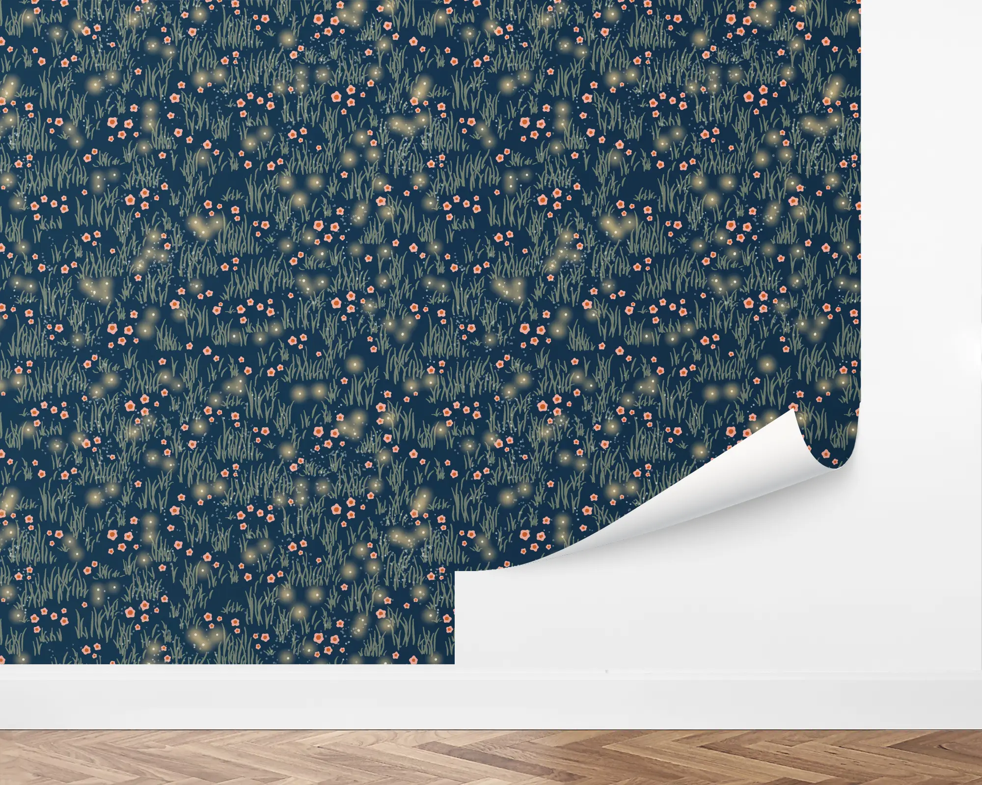 Add an enchanting touch to your child's room with our Firefly Garden Peel And Stick Removable Wallpaper. The yellow glow of fireflies and glitter-like specks dance over a background of grass and small pink flowers spread over dark blue, reminiscent of a garden at night. Choose from hundreds of possible colors to customize the wallpaper and create a uniquely magical design that perfectly fits your individual style!