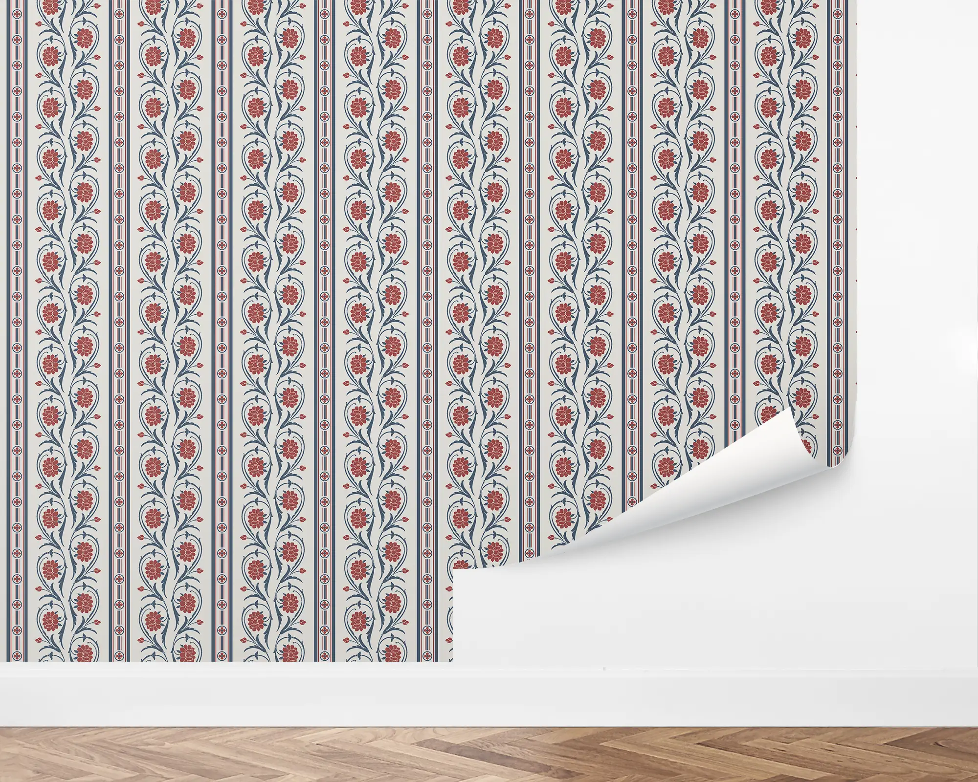 Floral Columns Wallpaper features elegant vertical stripes intertwined with charming stylized blooms in soft red and deep blue tones, creating a fresh, heritage-inspired look on a warm white backdrop. This classic floral stripe pattern brings timeless structure and subtle vintage charm to dining rooms, hallways, bedrooms, and cottage-style interiors—made even more versatile with editable colors to match any palette. A perfect option for those seeking a refined, uplifting wallpaper that blends traditional floral motifs with crisp, modern appeal.