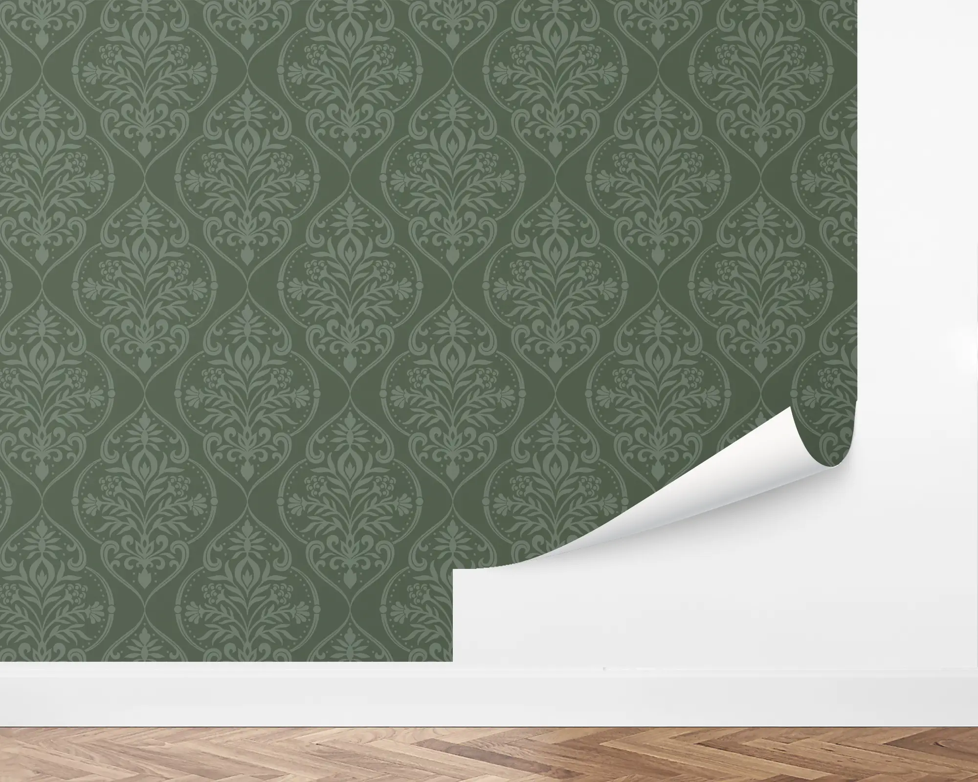 Create a timelessly elegant space with our Floral Damask peel and stick removable wallpaper. This monochromatic pattern features a dark motif of repeating, damask-styled foliage. Personalize this with different color combinations to match your style perfectly!