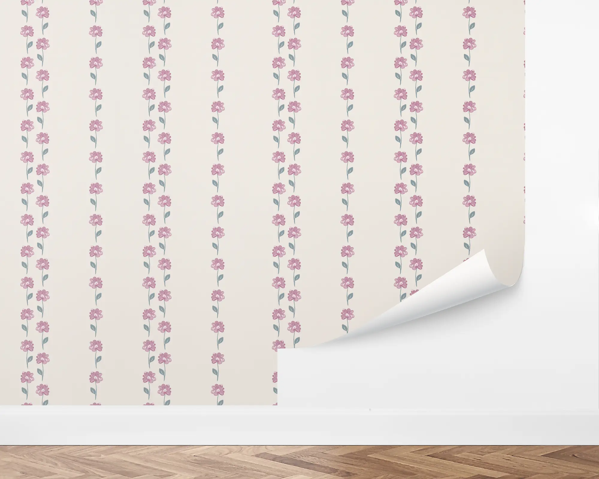 Our Floral Garland Peel and Stick Wallpaper is the perfect way to add a garden look to any room in your home. Pink watercolor flowers are planted in rows on top of an ivory background. Customize with endless color combinations to match your interior style!