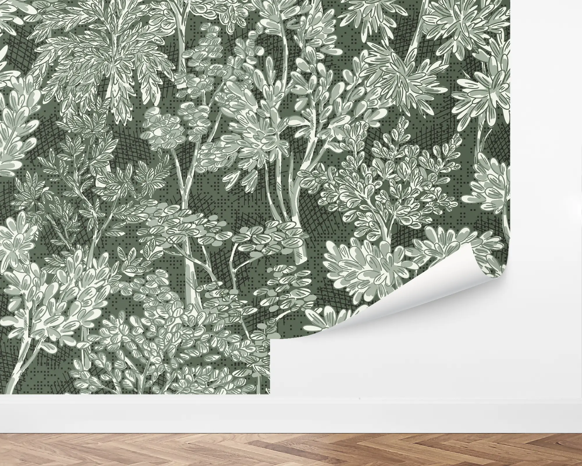 Bring the feel of retro greenery to any wall in your home with our Floral Sketch Peel and Stick Wallpaper. Tea and sage illustrations of botanicals branch out on top of an army background. Personalize with your favorite combinations of colors to match your interior style perfectly!