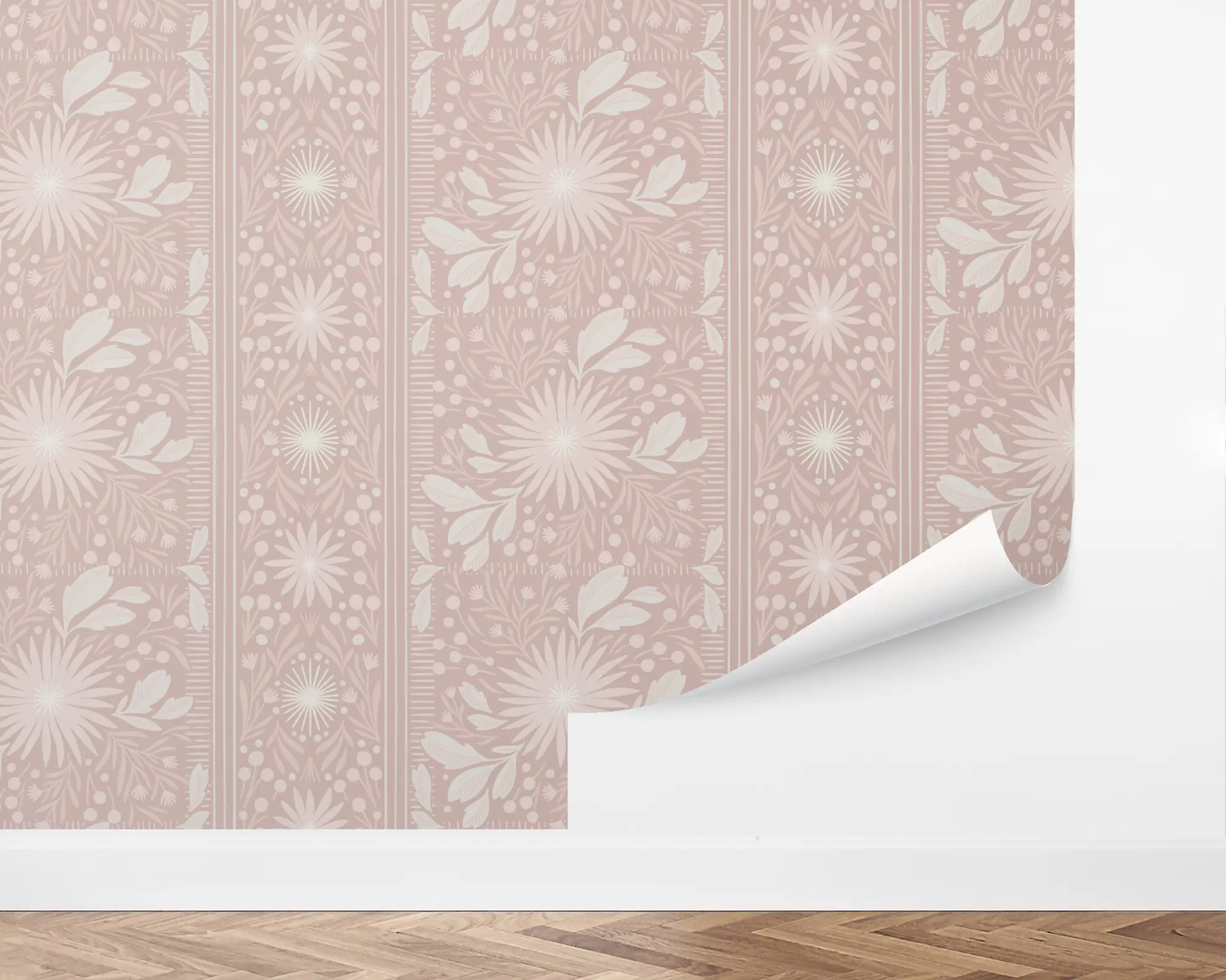 Our Flower Rows Peel and Stick Wallpaper are sure to add a classic farmhouse statement to any wall in your home. Illustrations of flowers, foliage, and dots are placed on top of a blush background. Personalize with endless color combinations to be perfect.