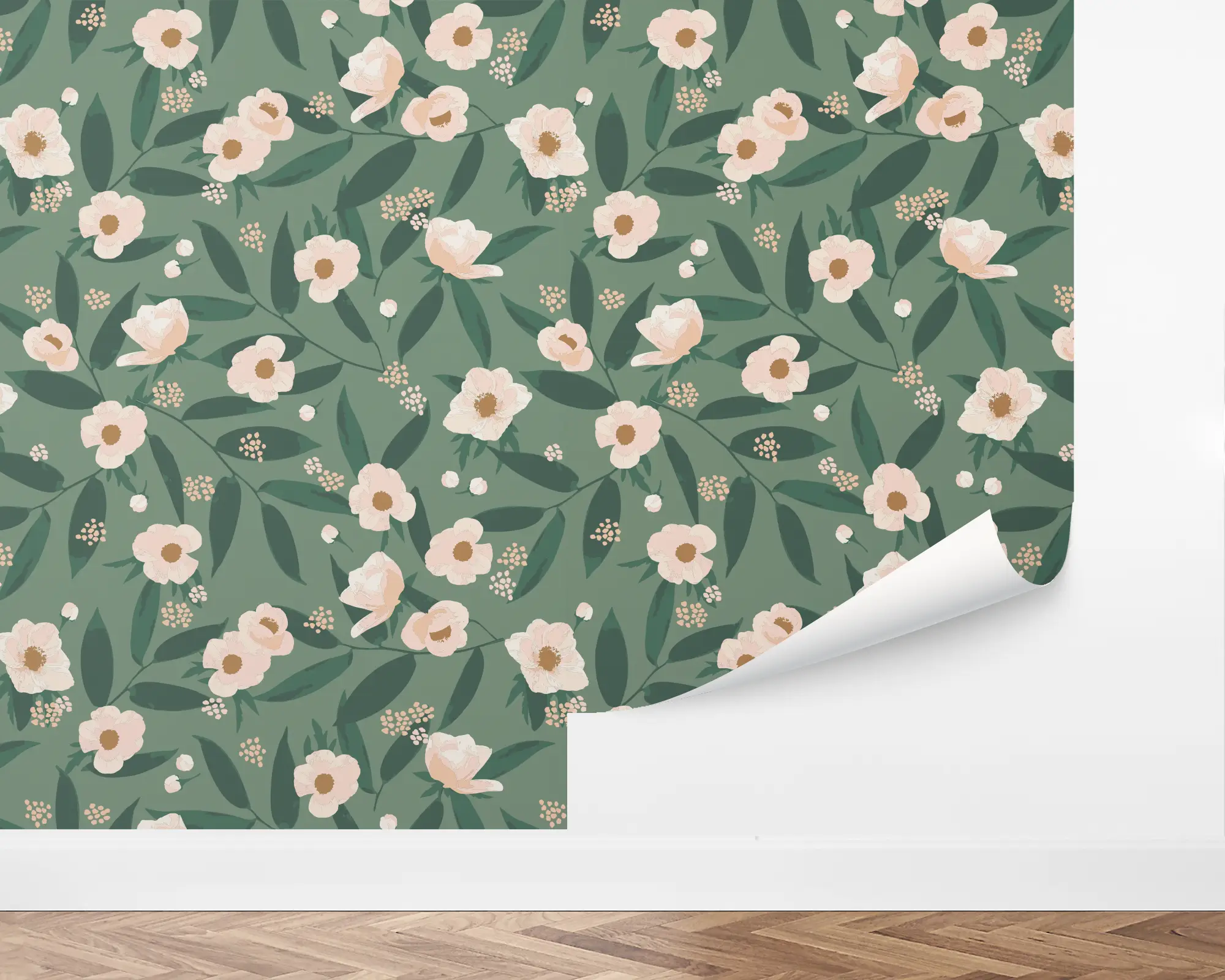 Our Green Fleur Peel and Stick Wallpaper are the perfect way to add a garden touch to any wall in your home. Pink illustrations of flowers and green leaves are planted on top of a kale background. Choose from endless color combinations to match your personal style!