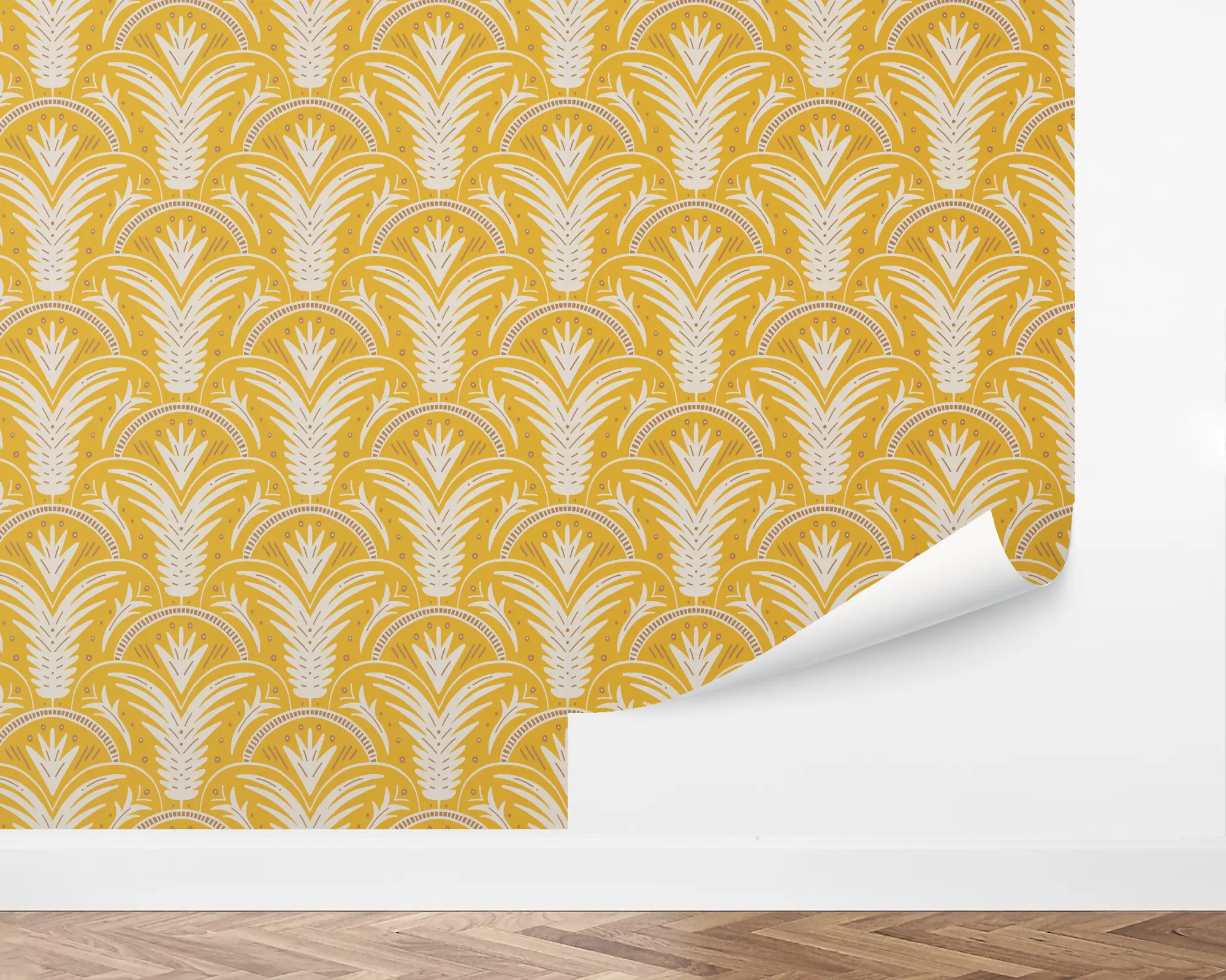 Our Jungle Damask Peel and Stick Wallpaper are sure to add a bright, eye-catching statement to any wall in your home. Shell illustrations of foliage are planted on top of a goldenrod background. With endless color combinations to customize with, this is sure to match your interior style perfectly!