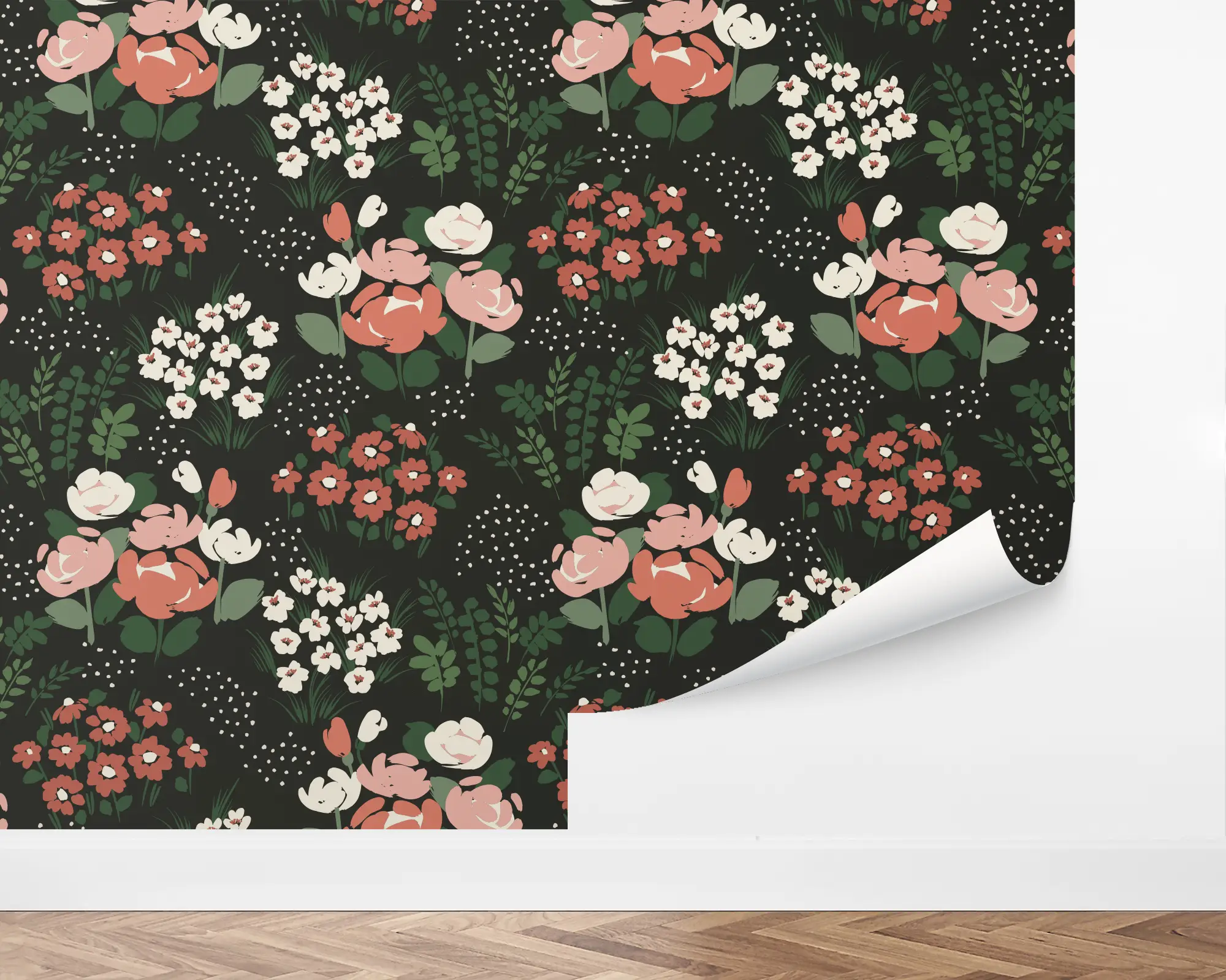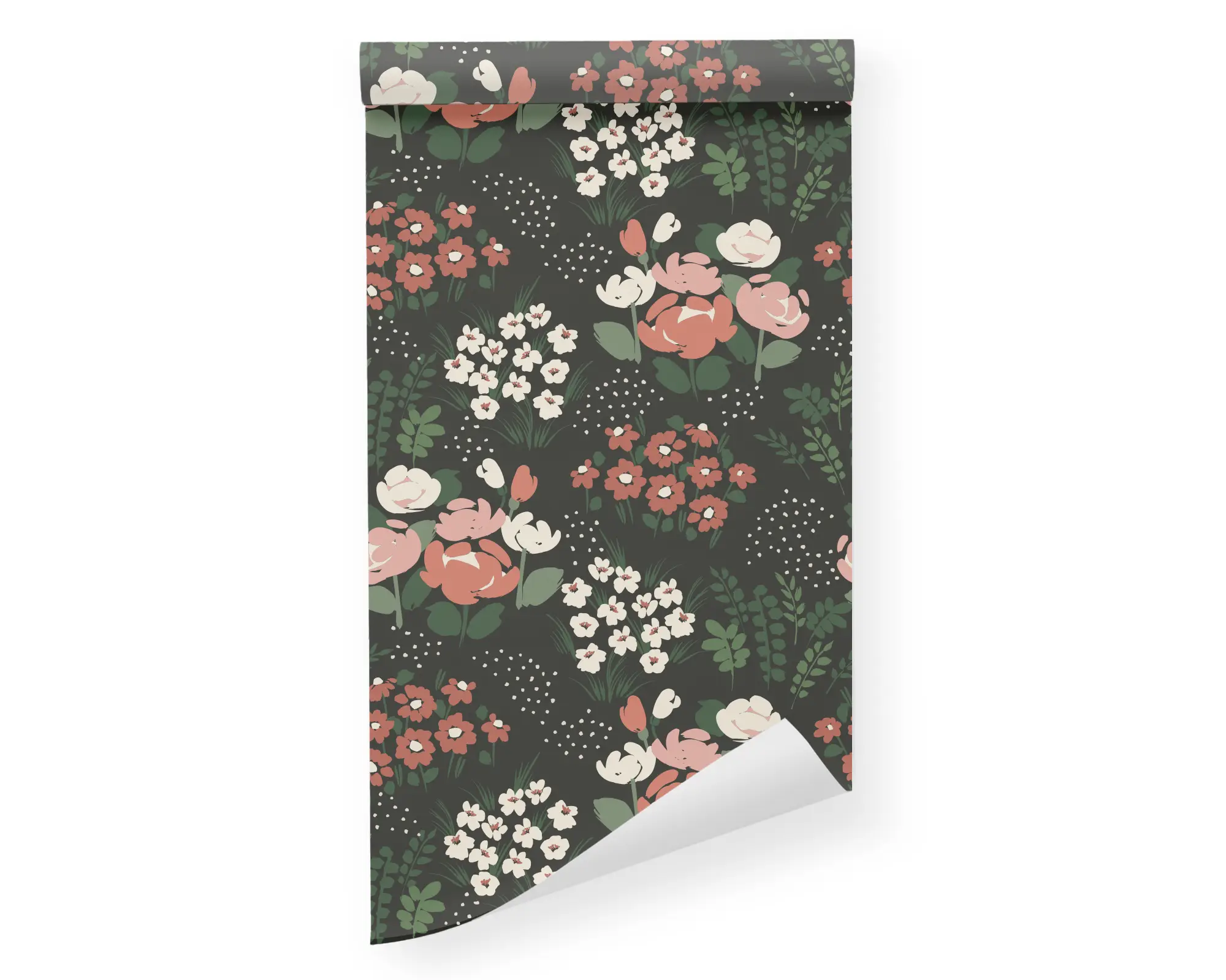 Decorate your walls in our sweet Large Tulips peel and stick removable wallpaper! Simplified, abstract flowers of all different shapes and sizes cover this design, against dark green.