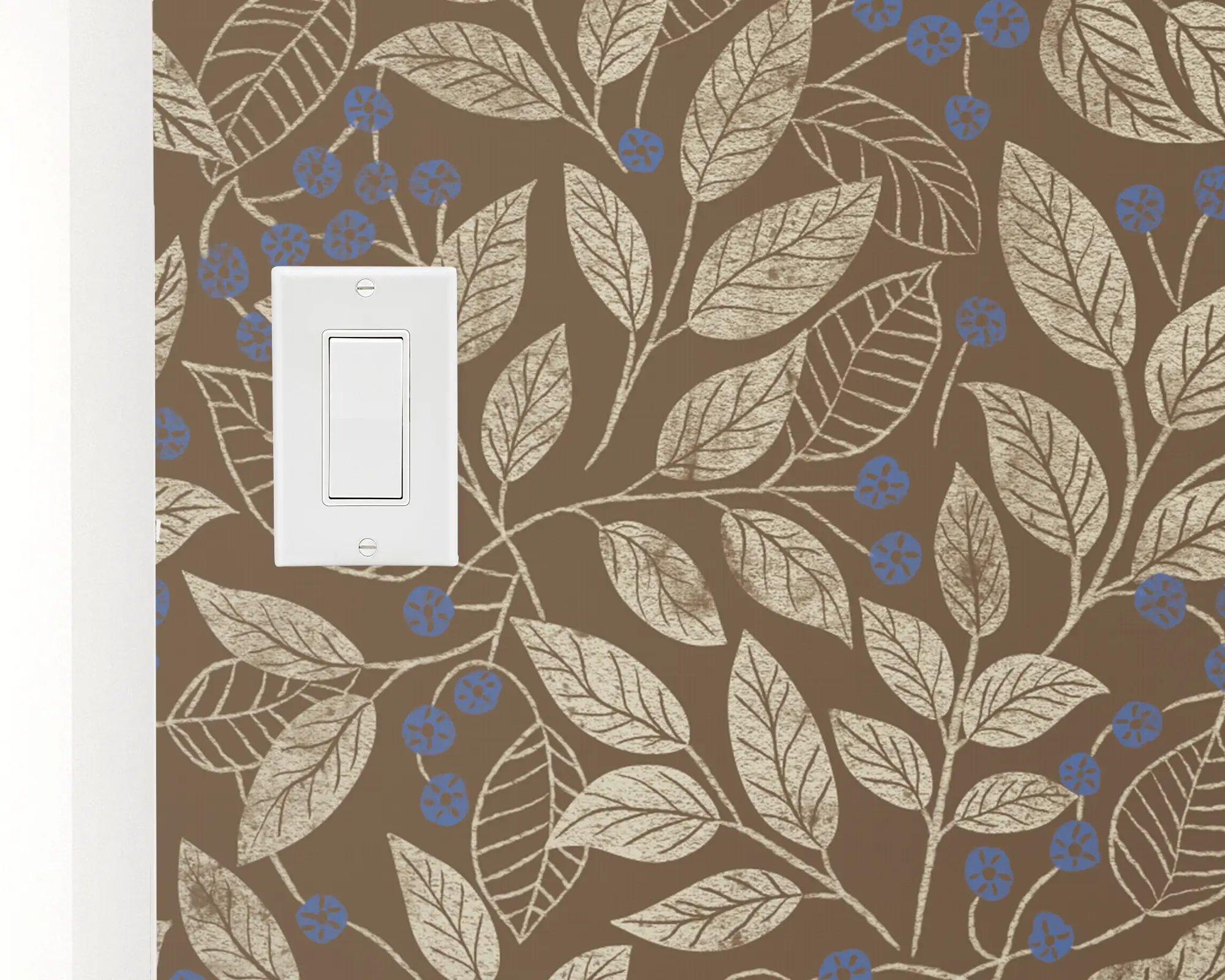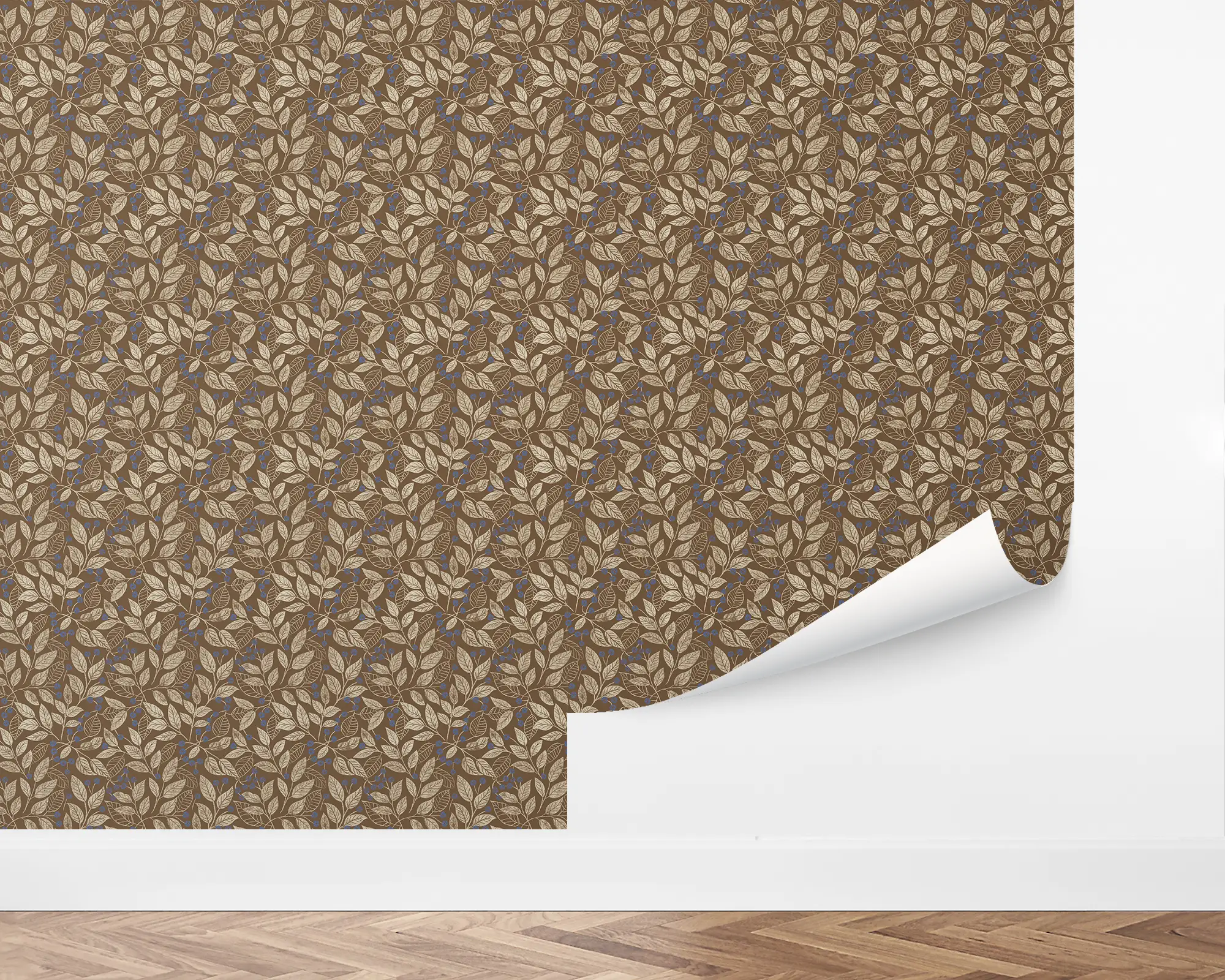 The Leaf Berry Wallpaper evokes the cozy charm of autumn woodlands with its rich brown backdrop and intricate golden leaves accented by delicate blue berries. The repeating botanical pattern adds natural warmth and depth to dining rooms, studies, or vintage-inspired interiors. Elegant yet understated, it brings a sense of organic texture and timeless craftsmanship to any space. Designed for ease and flexibility, this peel and stick wallpaper is removable, renter-friendly, and customizable in over 200 color options.
