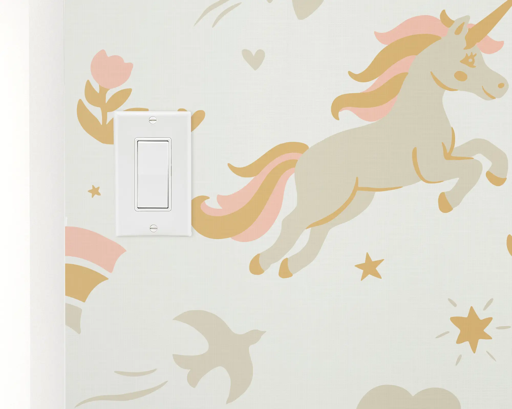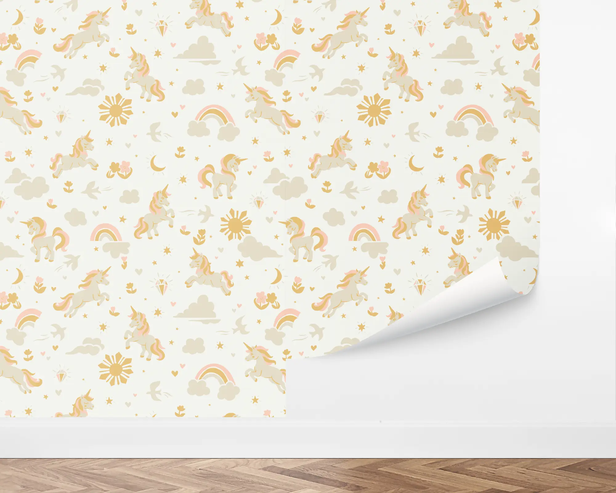 Create an enchanting space with our Magical Unicorns Peel and Stick Removable Wallpaper. This fun wallpaper features playful, prancing unicorns flying through a sparkling sky. Customize this beautiful wallpaper that will spark your little one's imagination with any of our beautiful colors.