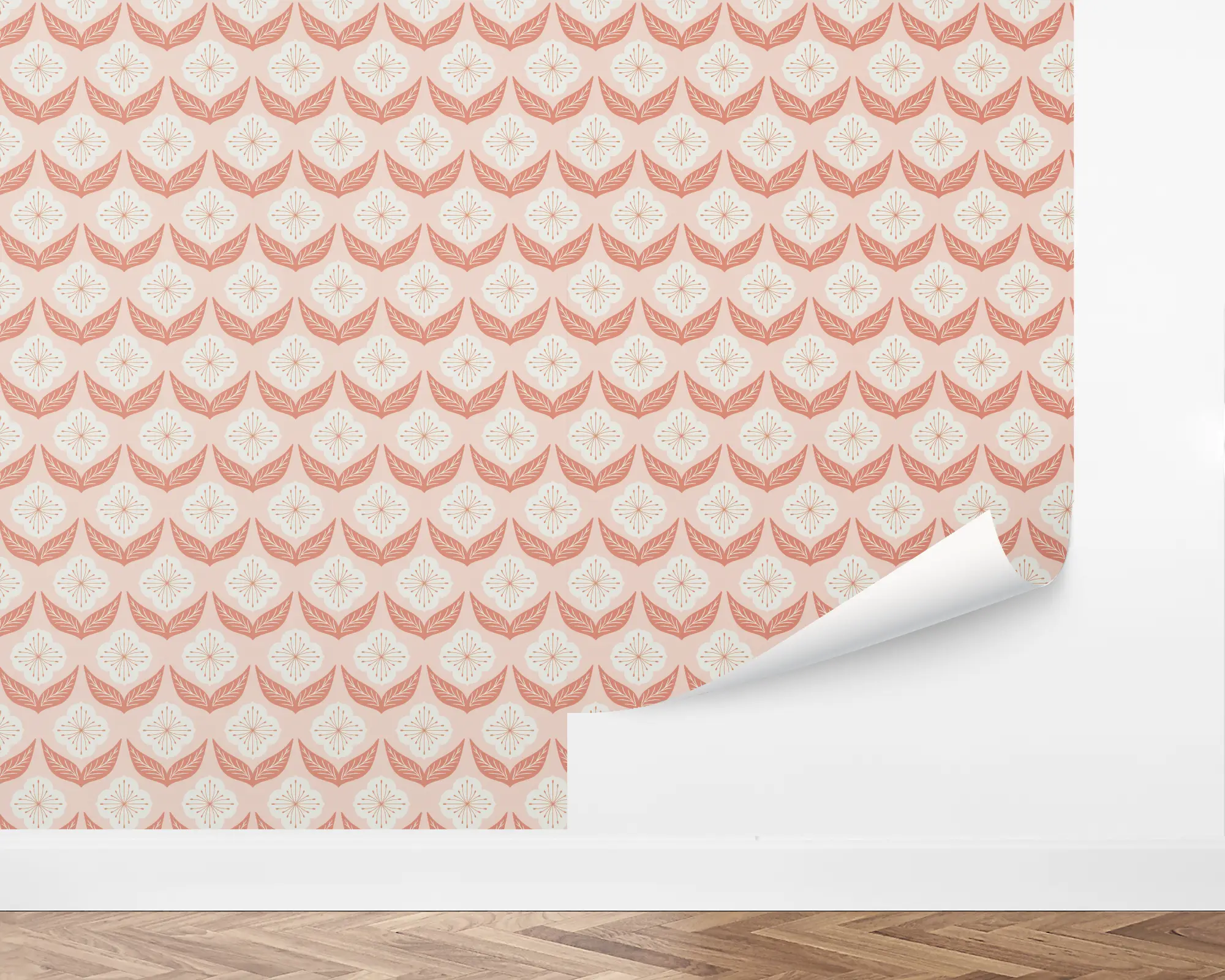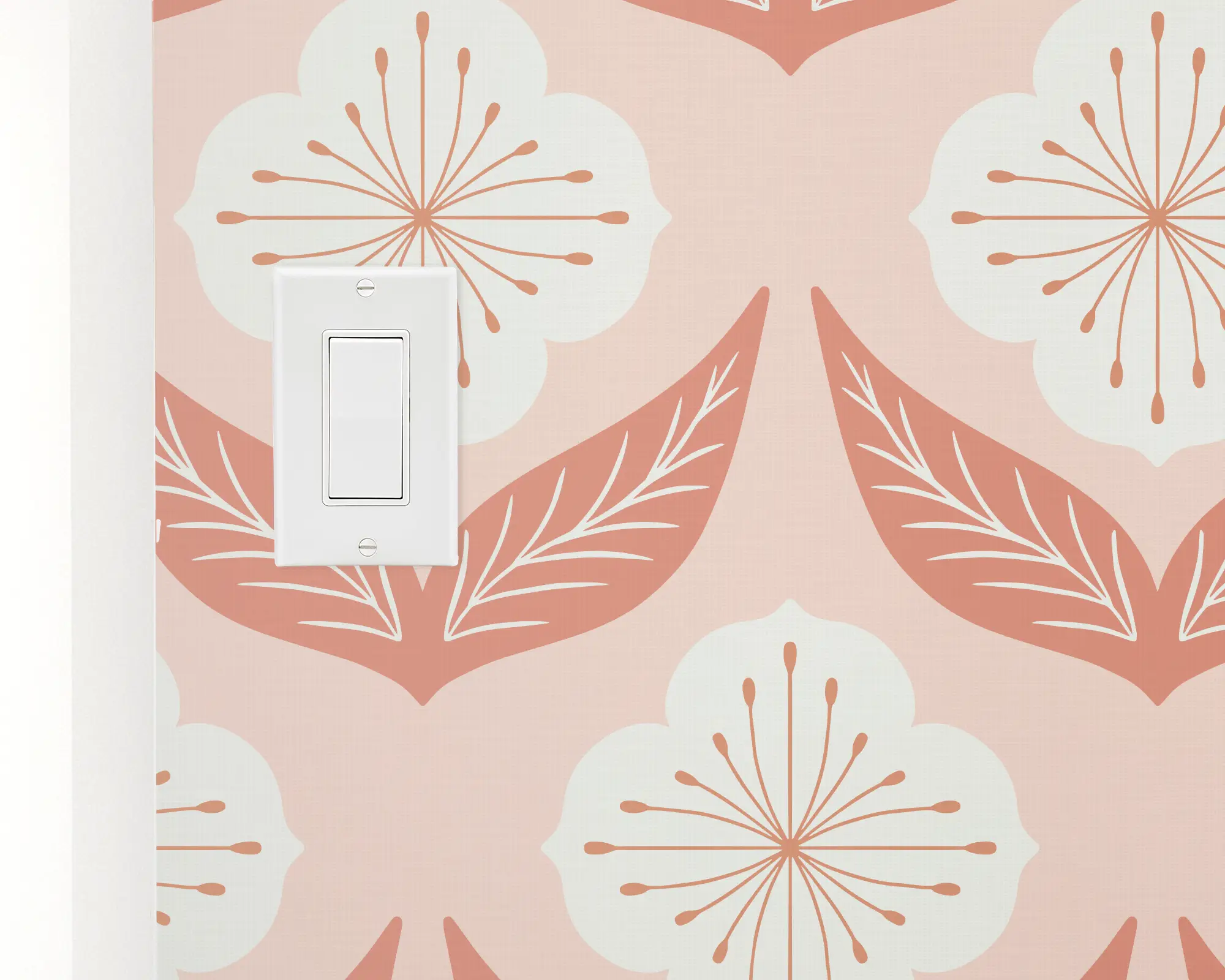 Bring the feeling of the outdoors indoors with our Modern Blossoms peel and stick removable wallpaper. Illustrations of white flowers and dark pink leaves lay gently on top of a light pink background. Explore endless color combinations to create the perfect interior for any room in your home!