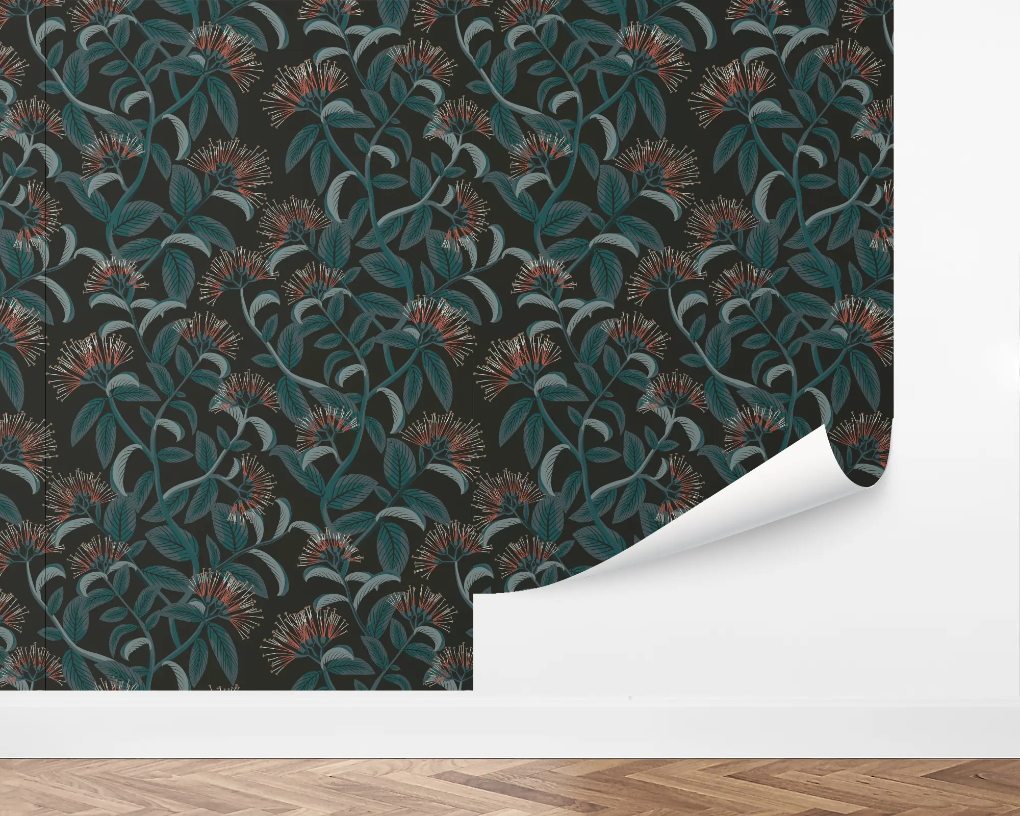 Create the perfect atmosphere with our Moody Metrosideros Peel and Stick Wallpaper. This beautifully elegant floral design features branches of New Zealand Christmas Tree blossoms over a dark background. Fully customizable with any of our gorgeous colors, this wallpaper is perfect for nearly any space.
