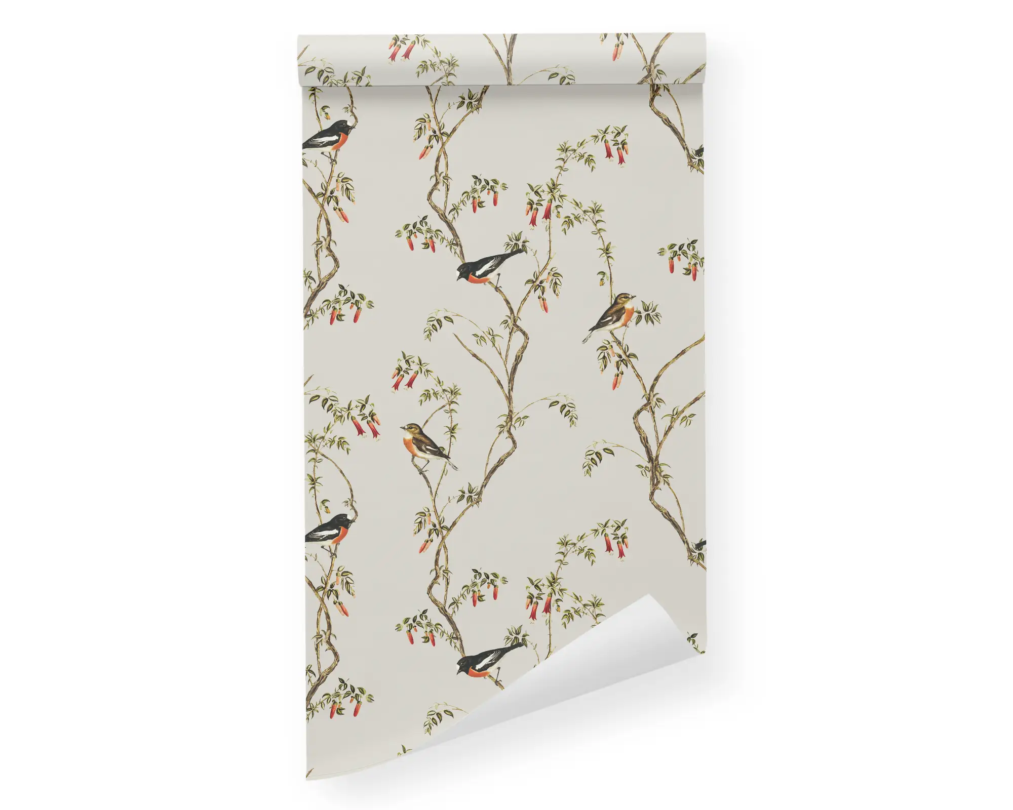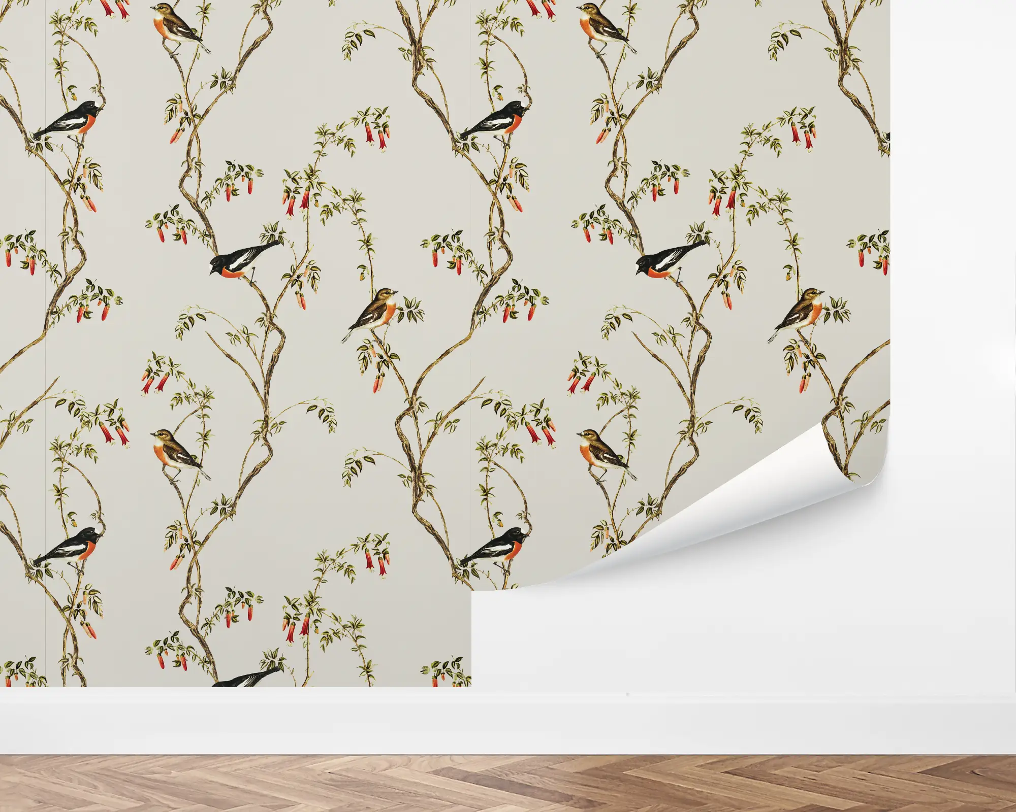 Create something beautiful and classical with our Robin and Vines Peel and Stick Wallpaper. This stunning design features delicate, flowered twigs and playful scarlet robins. Featuring a customizable background, this removable wallpaper is the perfect way to bring the serenity of nature into your home.