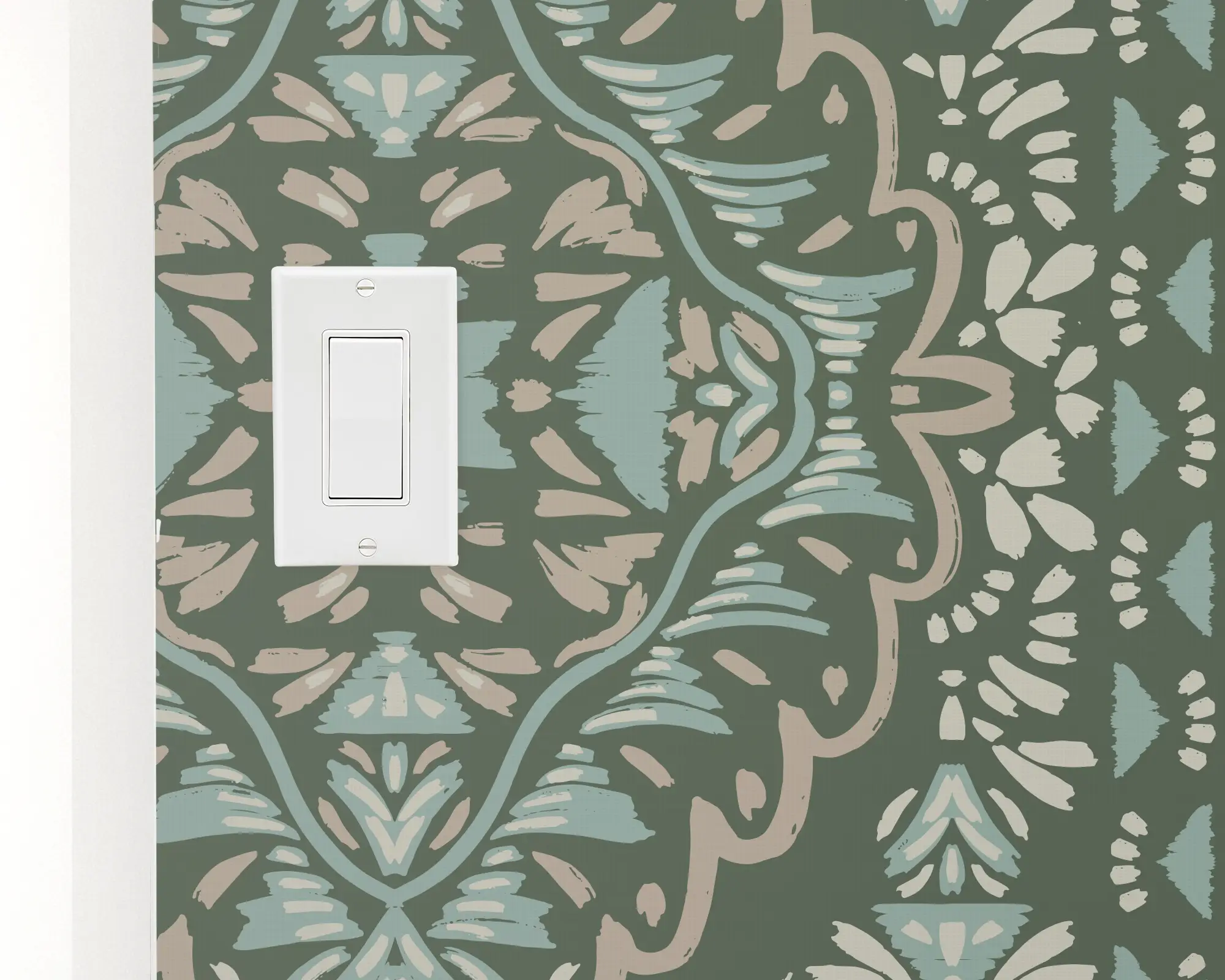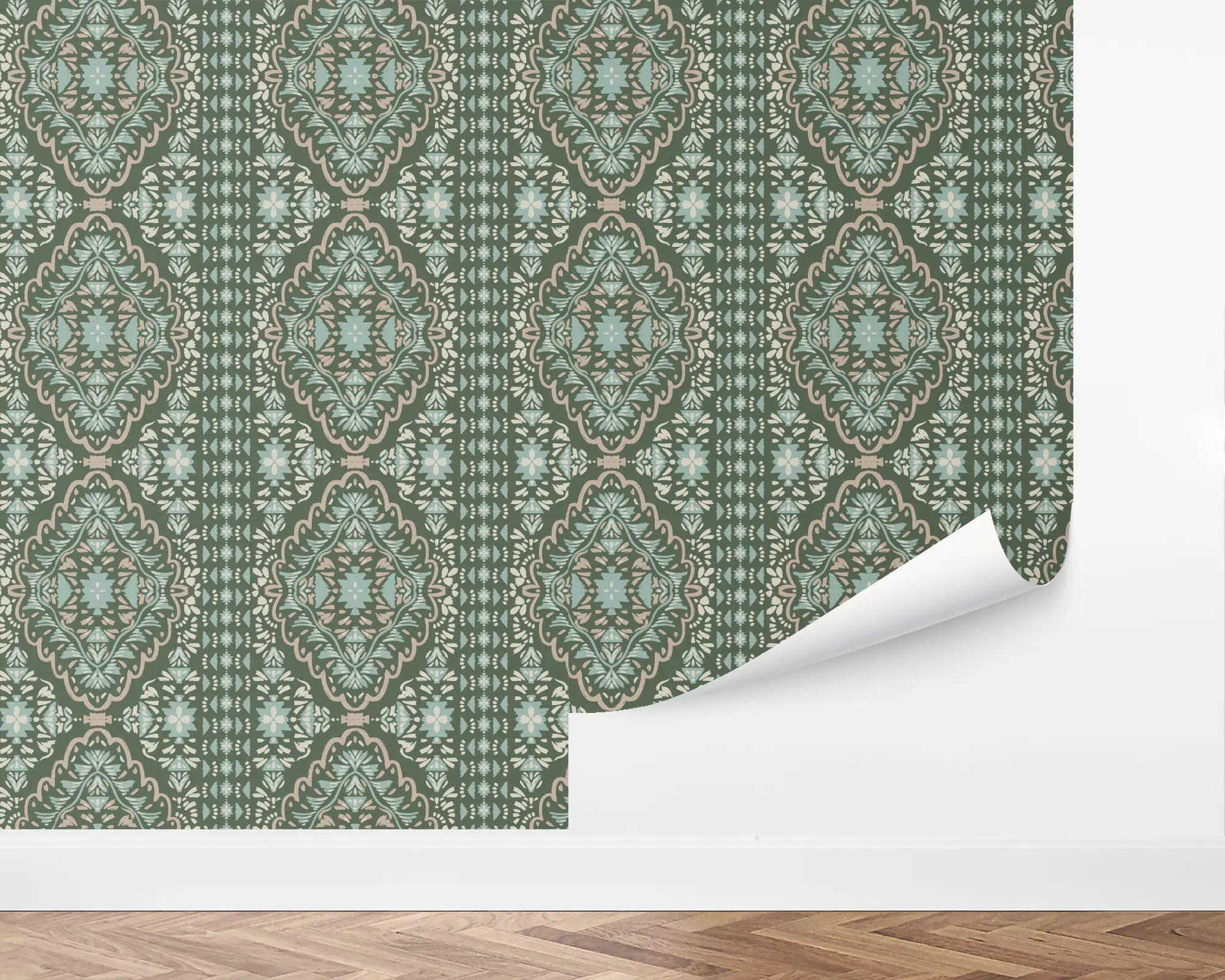 Create a classically unique look with our Rodeo Saddle Peel and Stick Removable Wallpaper. This rustic design features an ornate motif of diamonds and florals over a rich green background. Customizable with any of our stunning colors and high quality paper types, this wallpaper is perfect for nearly any space.