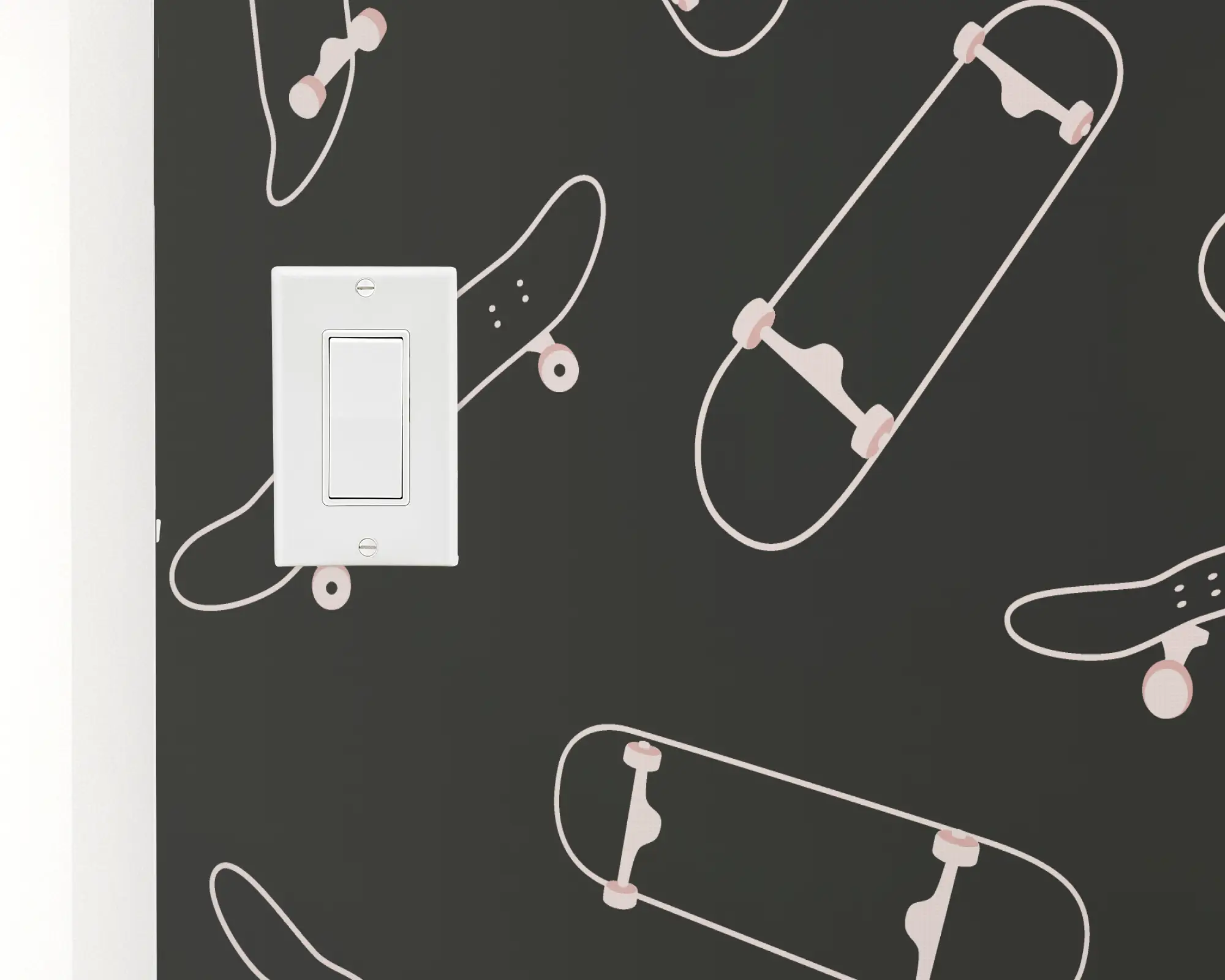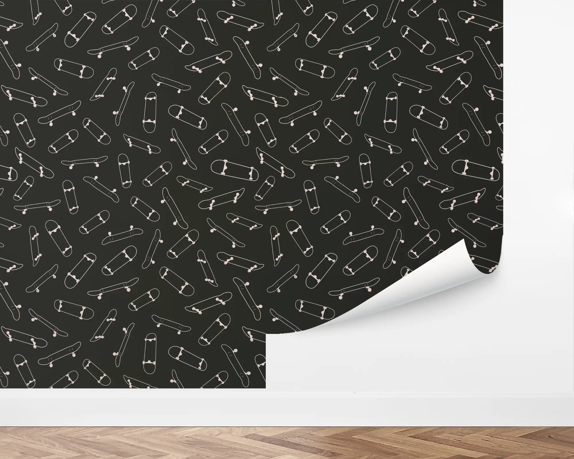 Add a playfully punk atmosphere to your kid's space with our Skateboard Decks peel and stick removable wallpaper. This unique design features a series of outlined skateboards across a dark background. Fully customizable with any of our striking colors, this design is perfect for the daredevil in your life.