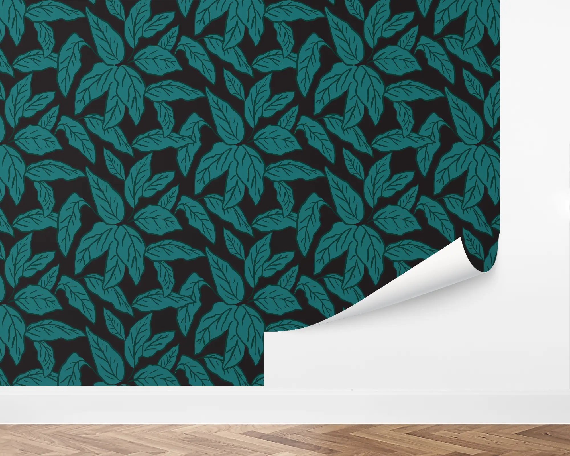 Our Sketched Leaves Peel And Stick Removable Wallpaper design is like a moody tropical getaway! Against a dark background, illustrated leaves grow into view in shades of turquoise green.