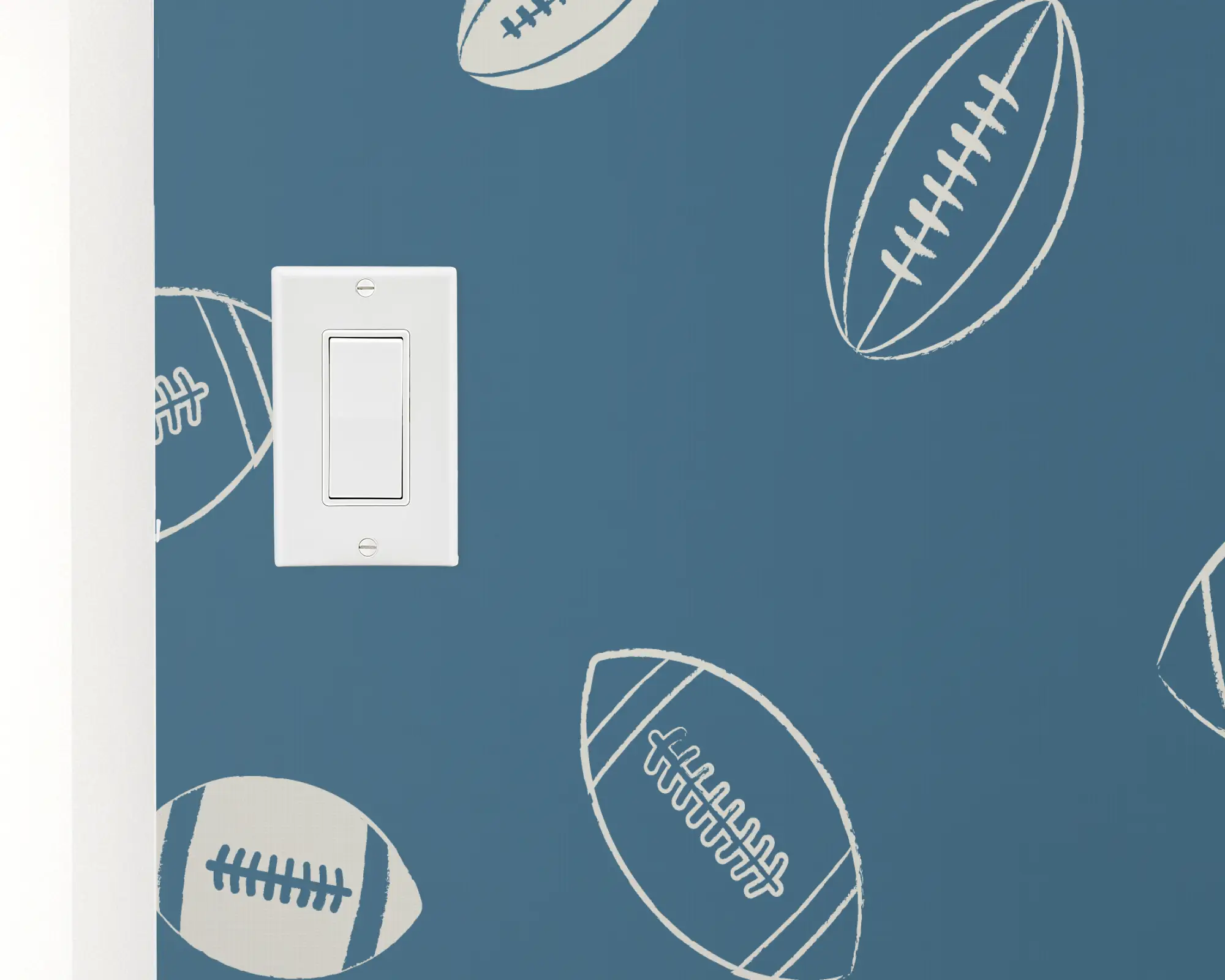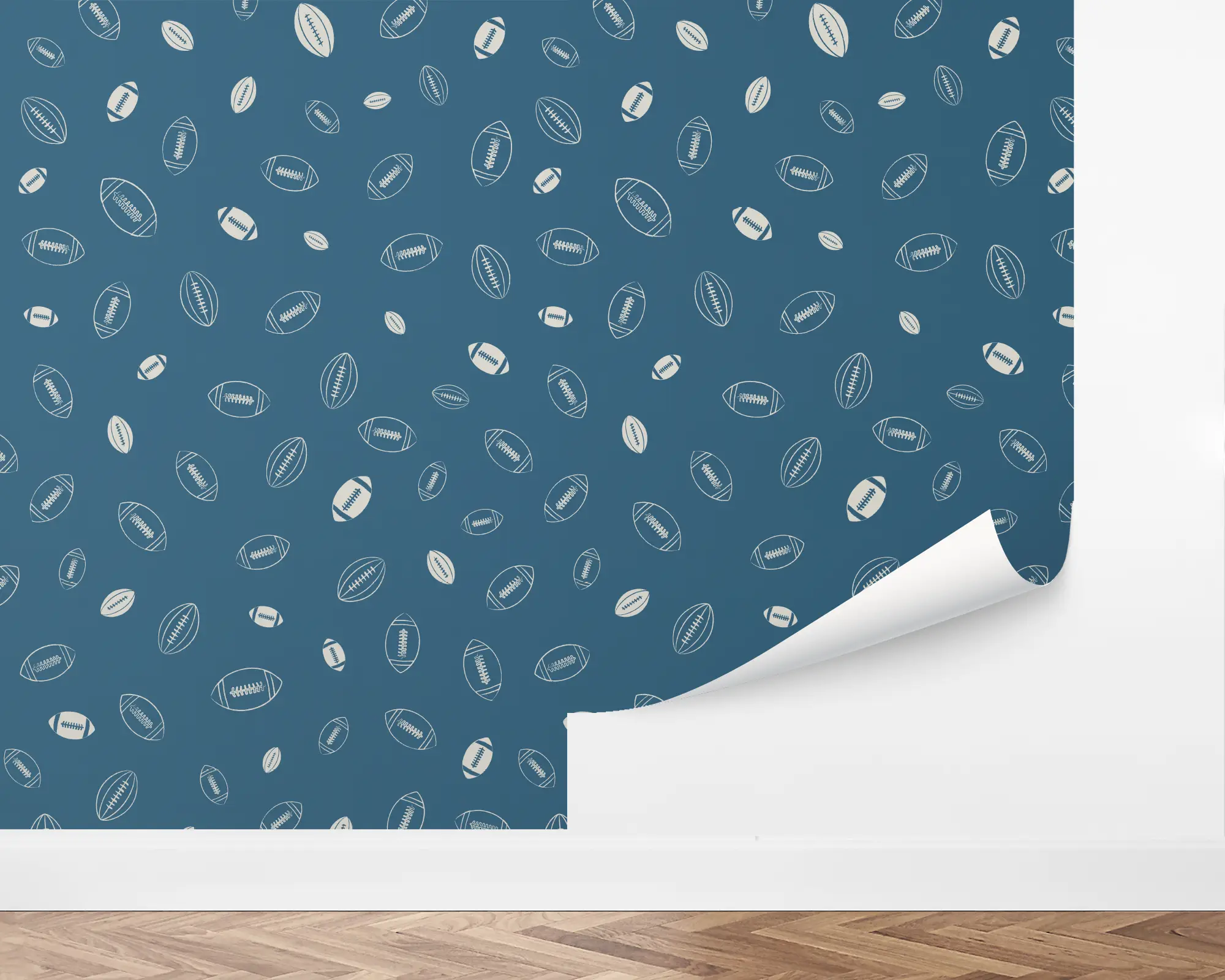 Create the perfect space for your sports lover with our Varsity Football Peel And Stick Removable Wallpaper. This fun wallpaper features various types of footballs rolling across a deep blue background. Fully customizable with any of our exciting colors, this wallpaper is perfect for your next interior design project.
