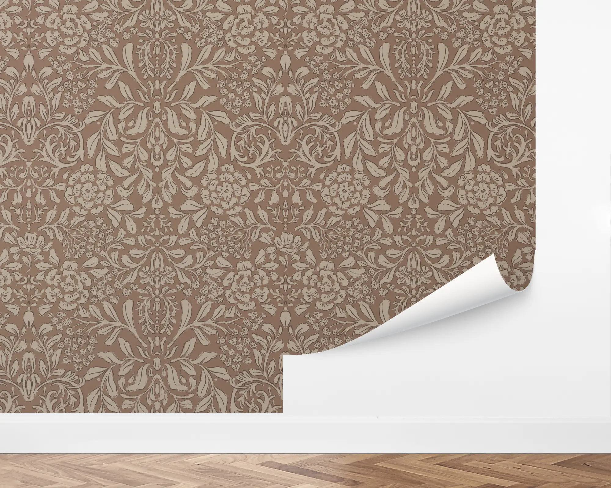 Introduce vintage-inspired elegance to your home with Bell Meadow wallpaper, showcasing an intricate damask floral pattern in a rich mocha brown and taupe color palette. This ornate design blends classic botanical motifs with modern peel and stick convenience, making it a top choice for those searching for damask wallpaper, vintage floral wallpaper, or sophisticated removable wall decor. Instantly elevate your dining room, living space, or bedroom with this timeless and renter-friendly wallpaper solution.