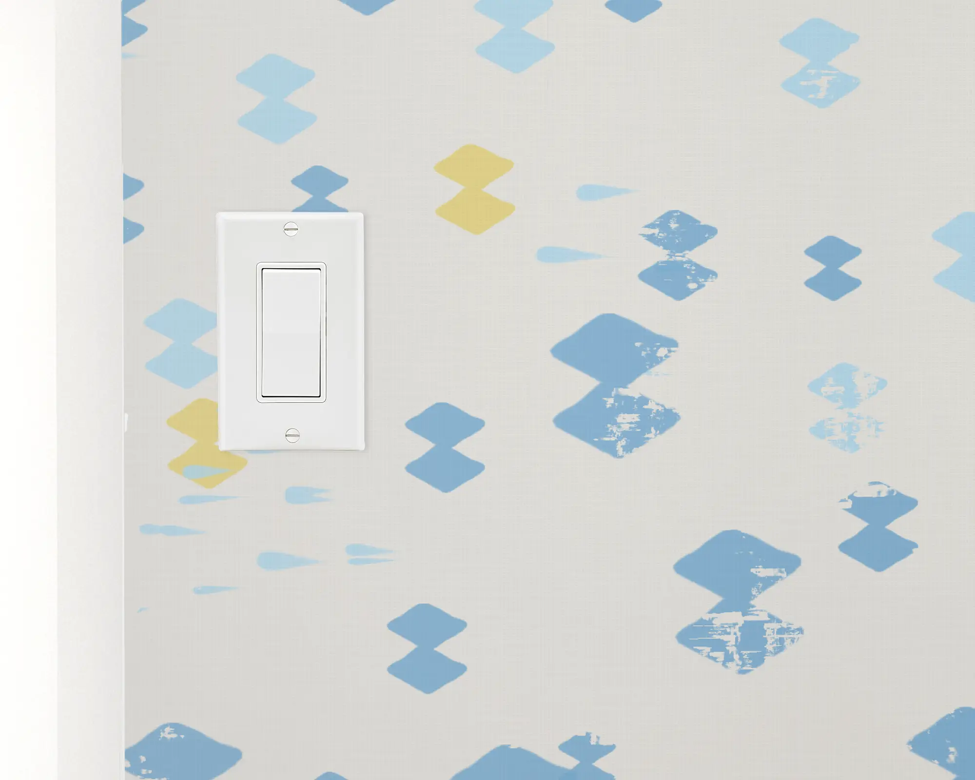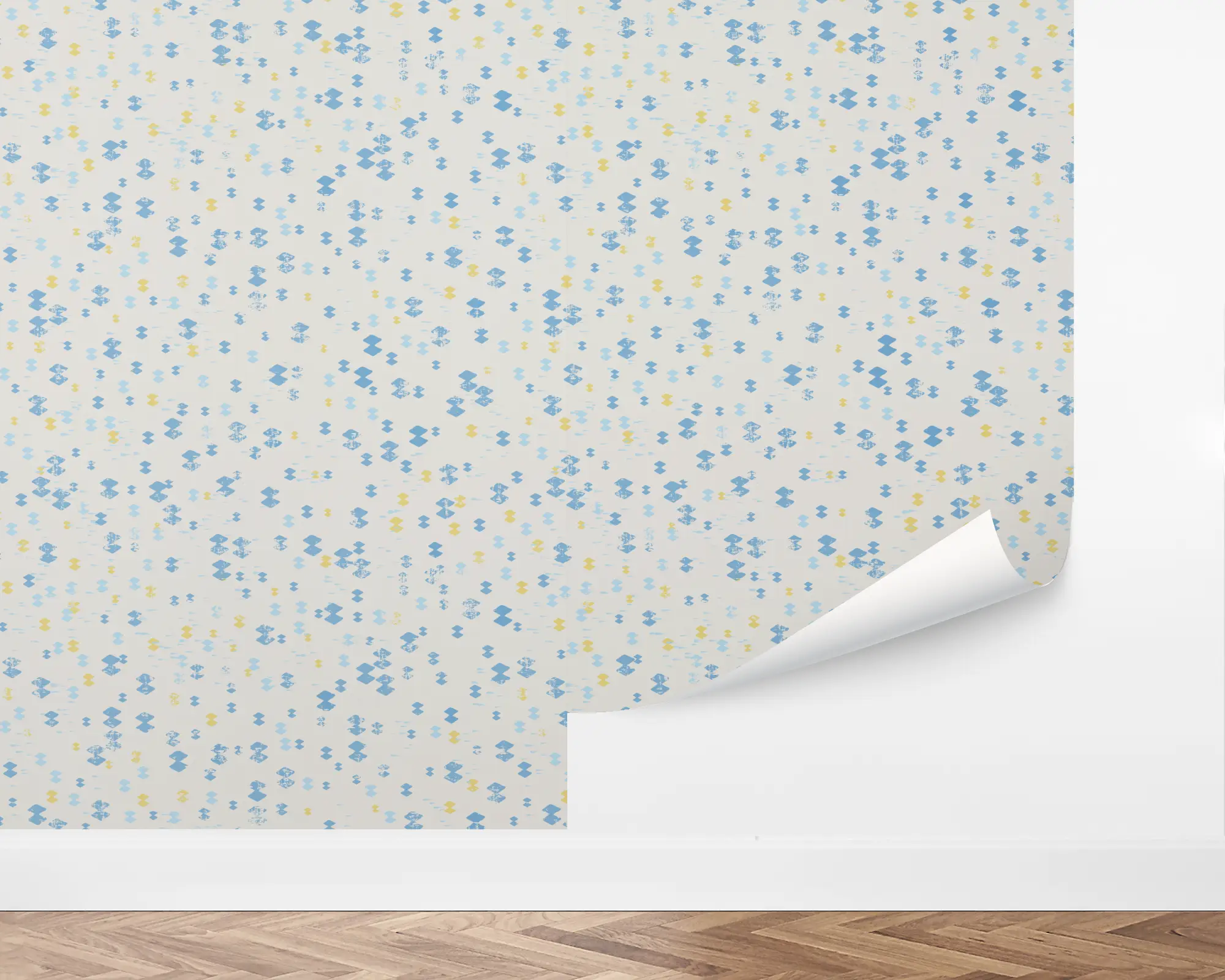 Dotty Diamonds wallpaper features playful blue and yellow dotted diamond motifs scattered across a soft white background, bringing a cheerful and modern touch to any nursery or kids’ space. This light, airy pattern is ideal for creating a bright and inviting atmosphere, blending whimsical style with a clean, contemporary feel. Transform your room easily with this peel and stick, customizable wallpaper that’s perfect for adding subtle color and joyful pattern.