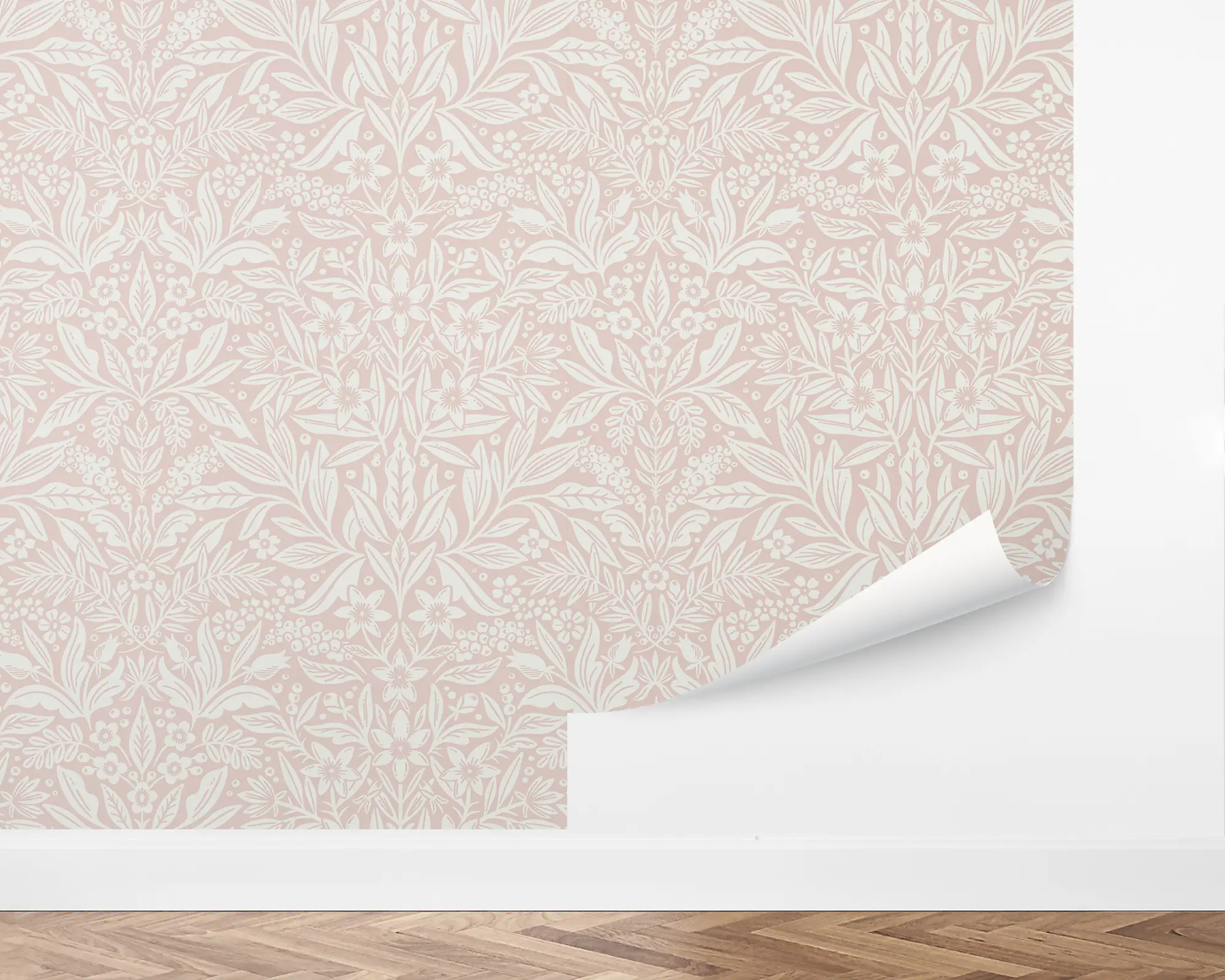 Floral Weave Wallpaper showcases an intricate, lace-like botanical pattern featuring softly interlaced leaves, blossoms, and stems in a delicate blush-and-cream palette. This timeless, small-scale design adds gentle texture and a serene feminine charm to bedrooms, nurseries, living spaces, and cottage-inspired interiors—enhanced by fully editable colors for seamless palette matching. A beautiful choice for anyone seeking a refined, airy floral wallpaper that feels both classic and modern.