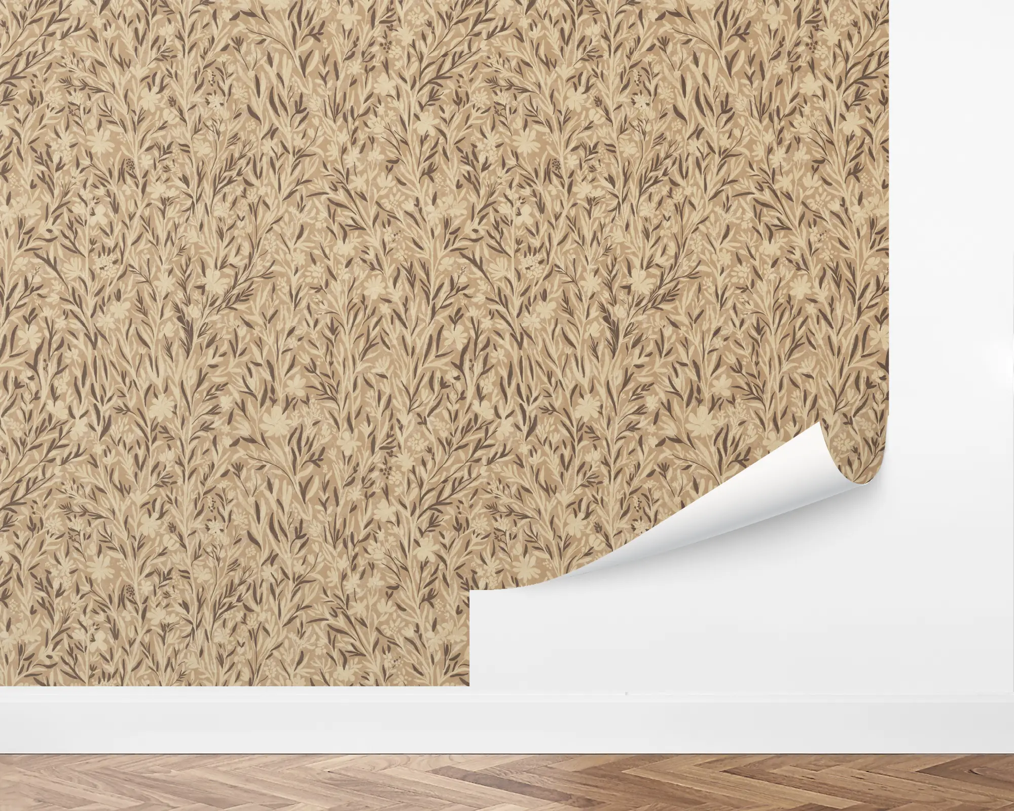Golden Gossamer Wallpaper features an intricate hand-painted floral pattern in warm golden beige tones with subtle cocoa brown accents. The delicate botanical detailing gives it an airy, vintage-inspired feel—ideal for bedrooms, powder rooms, or cozy hallways. With over 200 customizable color options and a removable peel and stick format, it brings timeless charm and flexibility to any space.