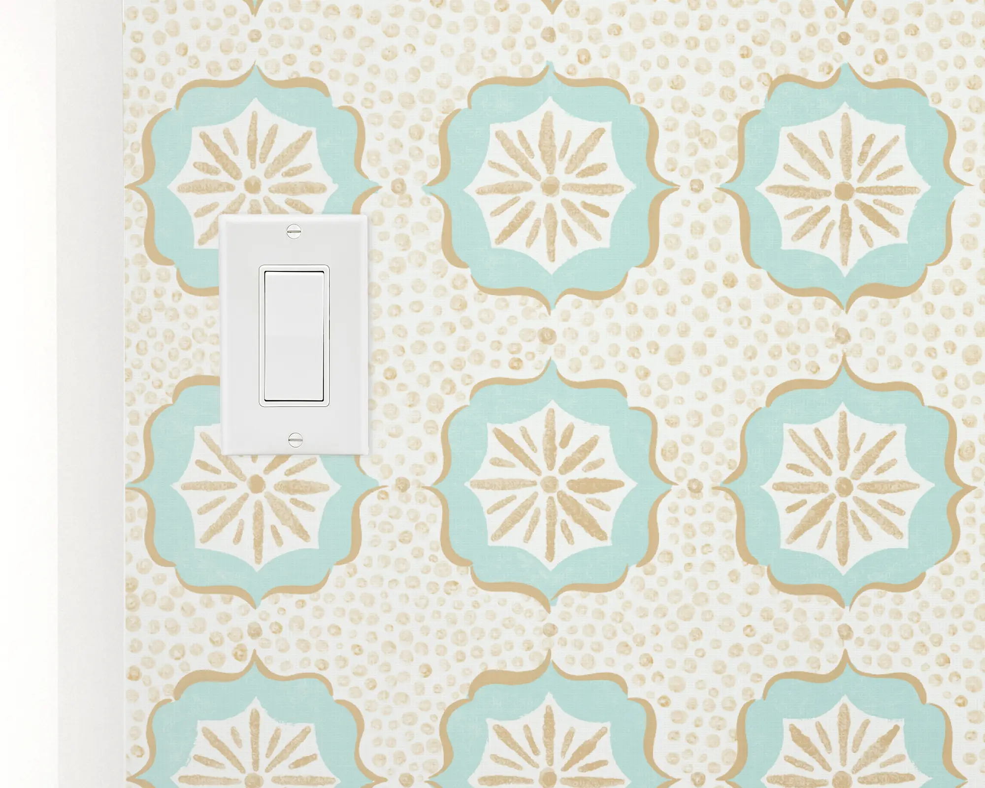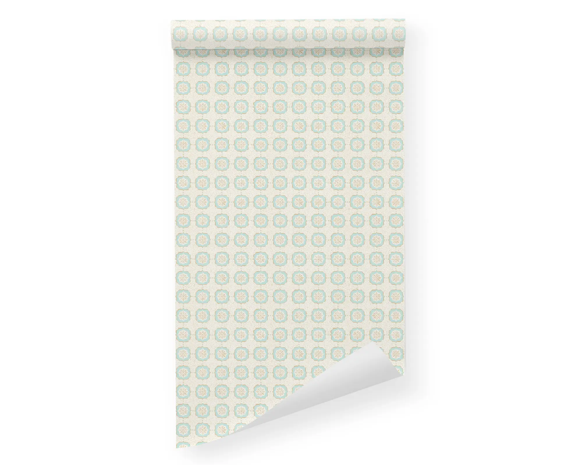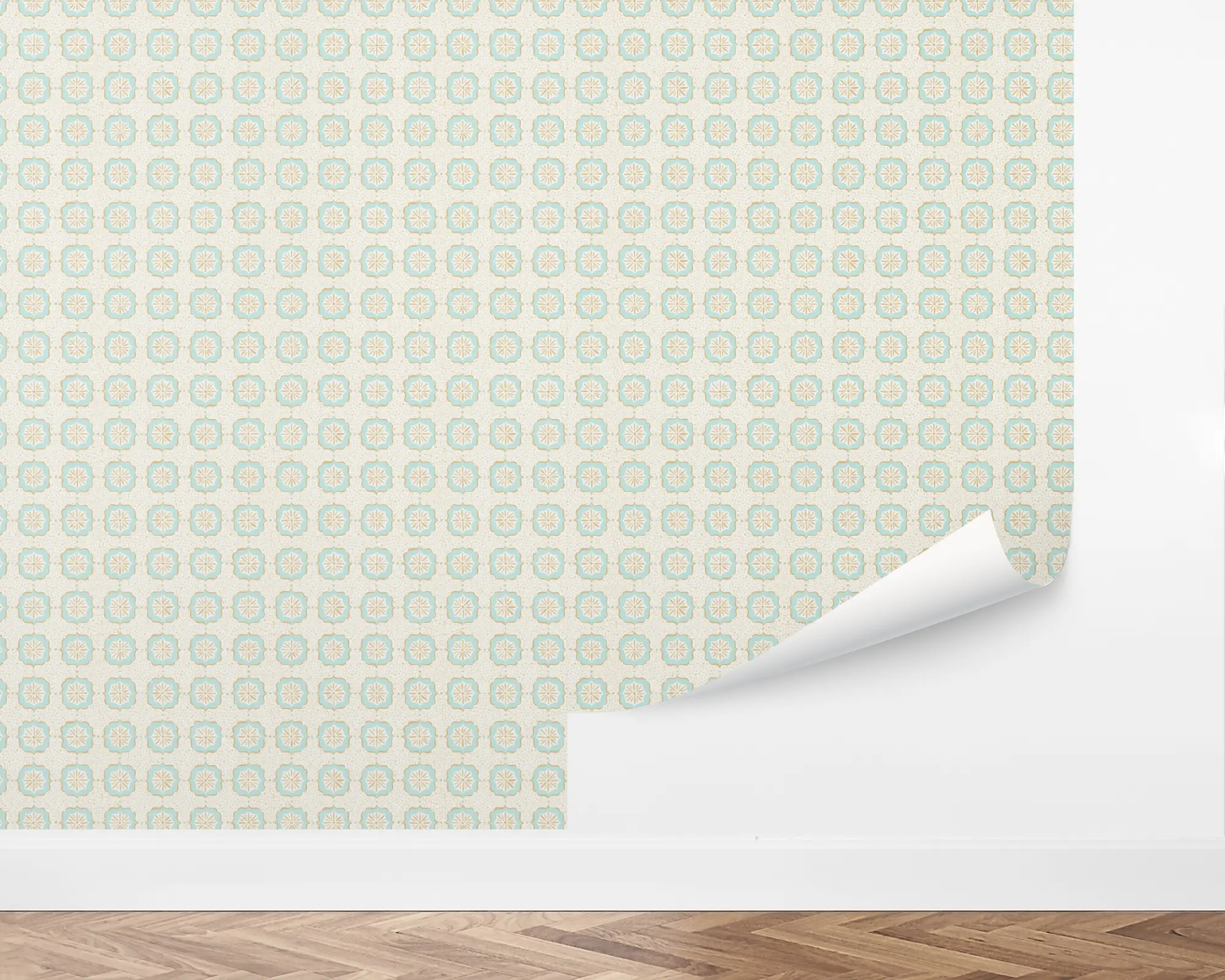 Starlet Lace wallpaper features a delicate geometric medallion pattern with soft, lace-inspired motifs in light green and cream tones, adding a vintage-modern charm to any space. This elegant, small-scale repeat is perfect for cottagecore, shabby chic, or Scandinavian interiors, providing a timeless and airy accent wall or full-room makeover. Transform your home with this customizable, peel and stick wallpaper that brings effortless sophistication and subtle pattern to your decor.