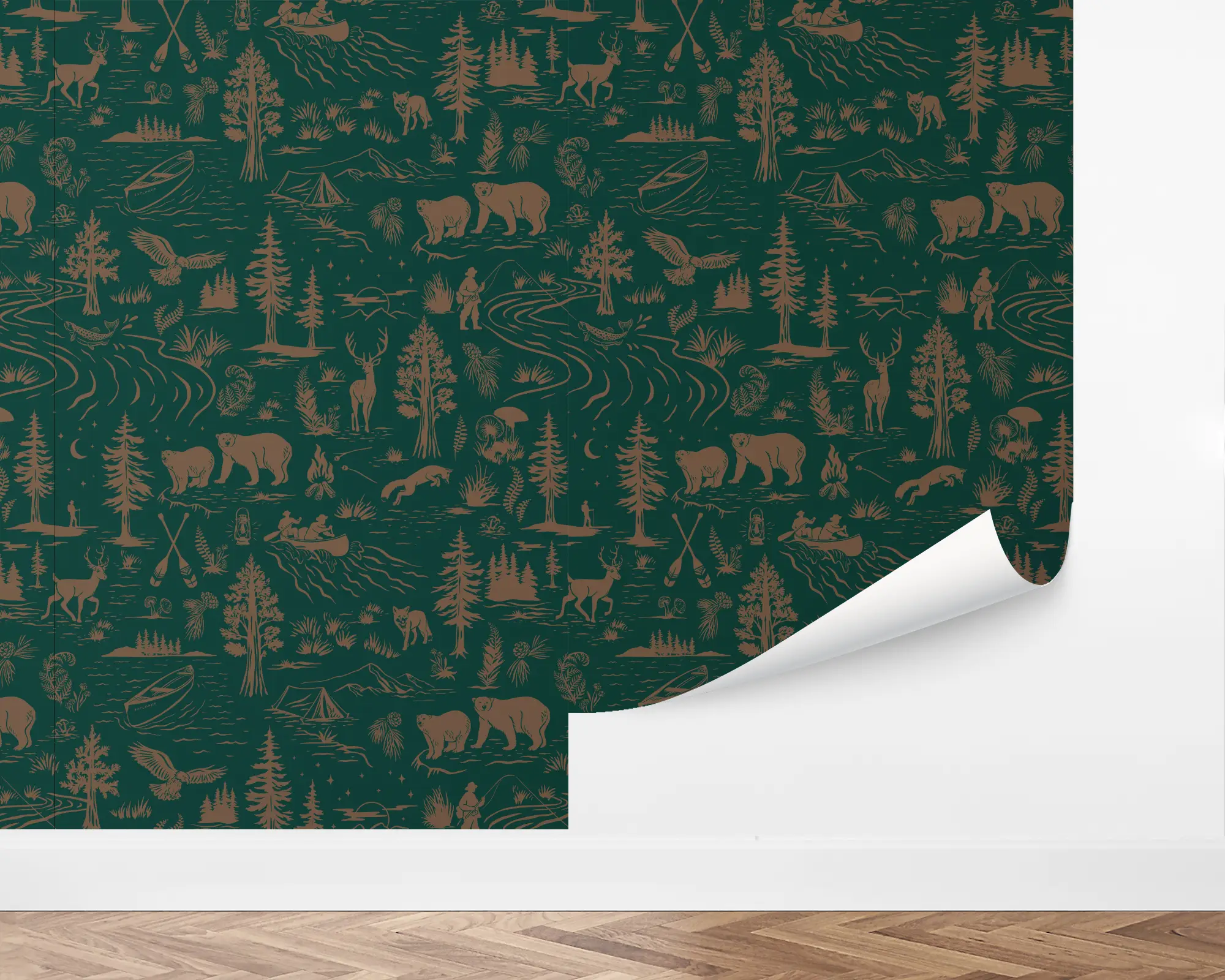 Bring the excitement of the great outdoors into your home with our Wilderness Adventure Wallpaper. This fun design features a stunning collage of pine trees, wild animals, rivers, mountains, and everything else you love about nature. Fully customizable with any of our gorgeous colors, this wallpaper is perfect for anything from a camper van to your own home.